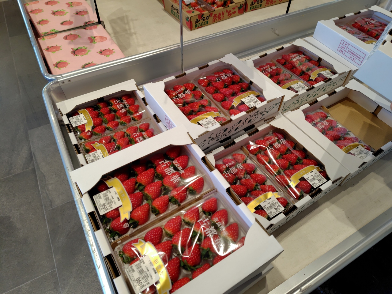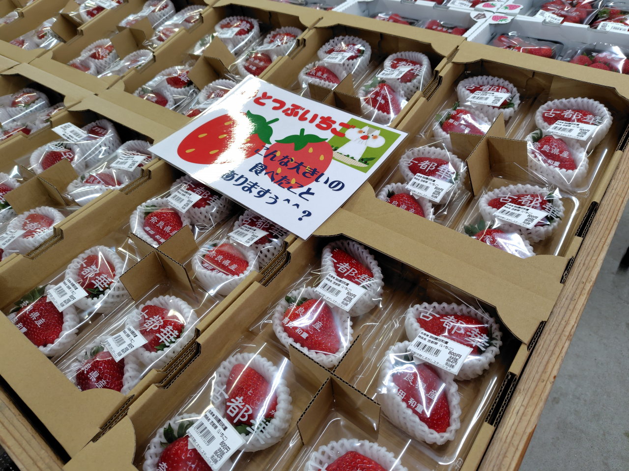 イチゴのシーズンになると各種いちごが並びます。午前中に行けばいいものを買うことが出来ると思いますが(粒の大きさで値段が違います)、午後から行っても残っています。