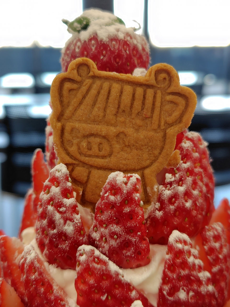 生クリーム、イチゴアイス、カスタードクリーム、ピスタチオ(?)のクリーム、アイス、一番下はフローズンストロベリーです。そして真ん中にはコーンフレークかと思いきやパイ生地が入っています。