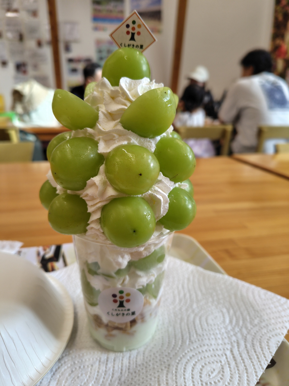 イチゴのシーズンは大人気。桃は期間が短いなどありますが、今回はシャインマスカットのフルーツパフェを食べに行きました。正直お値段は高いですが、ほとんどの方は家族等でシェアしています。特に特大パフェはマスカットのツリーのように大きいので、大人3人でシェアをしても多いかもしれません。
