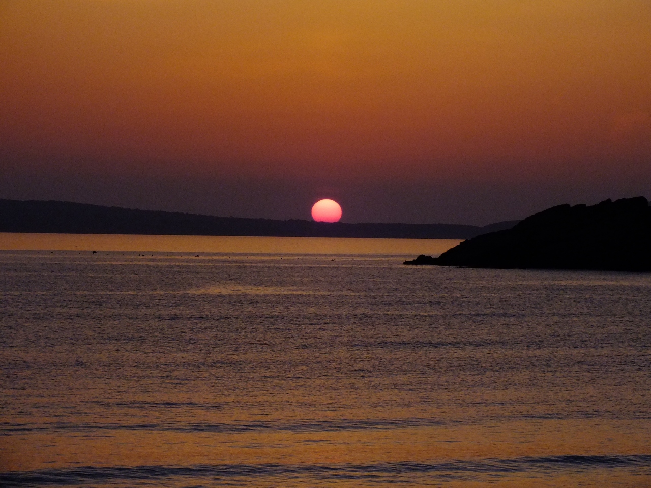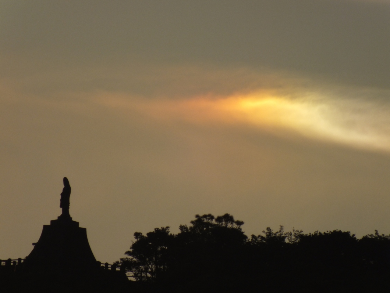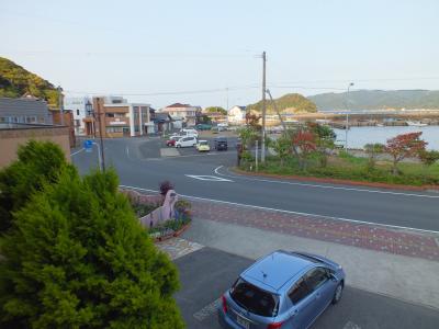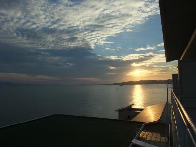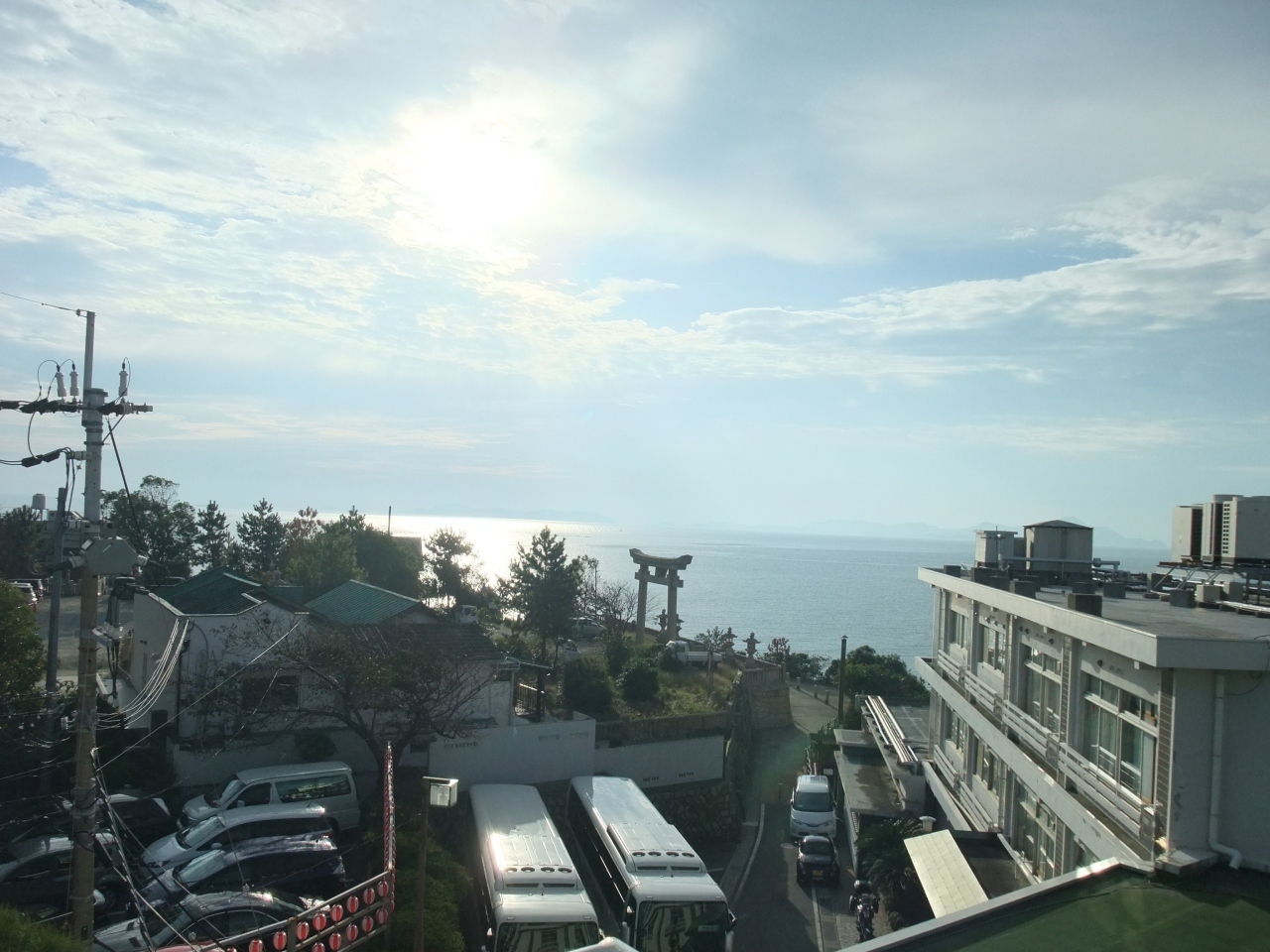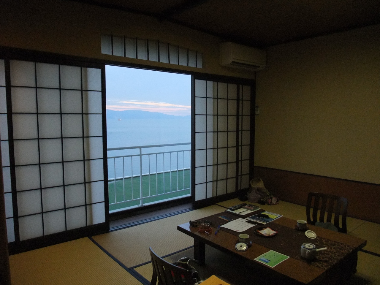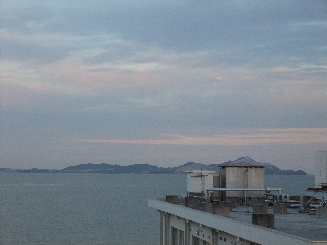 眺めは左方向に小豆島、本館の建物を挟んで右側は西側になり、この秋の時期のサンセットもギリ眺めることが出来ます。夏だともっと右側に沈みますから建物があって観えないです。
