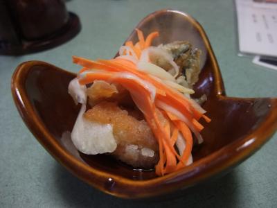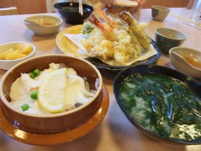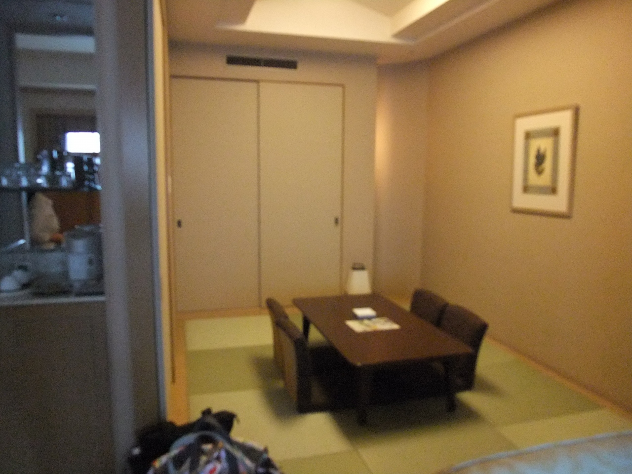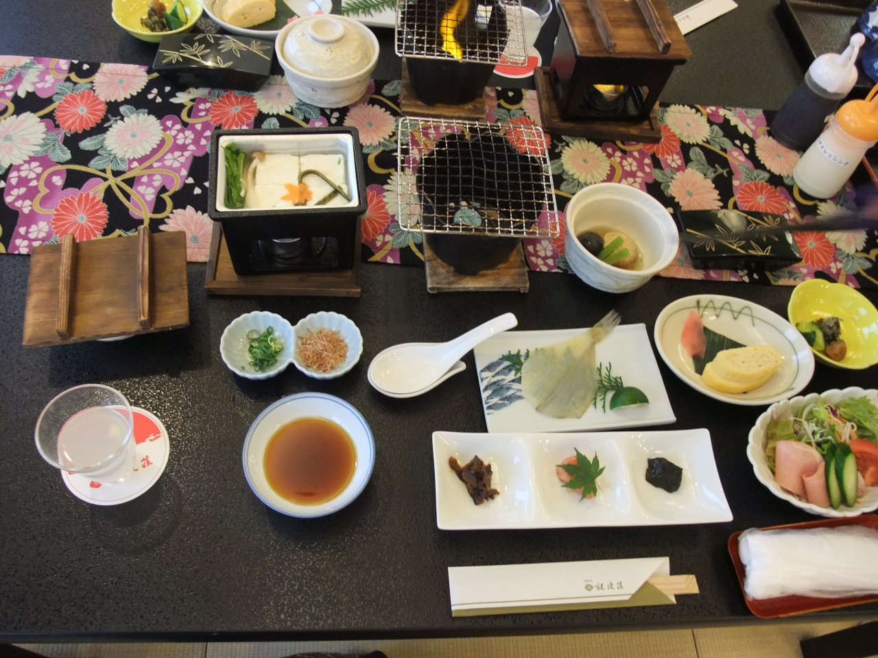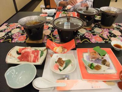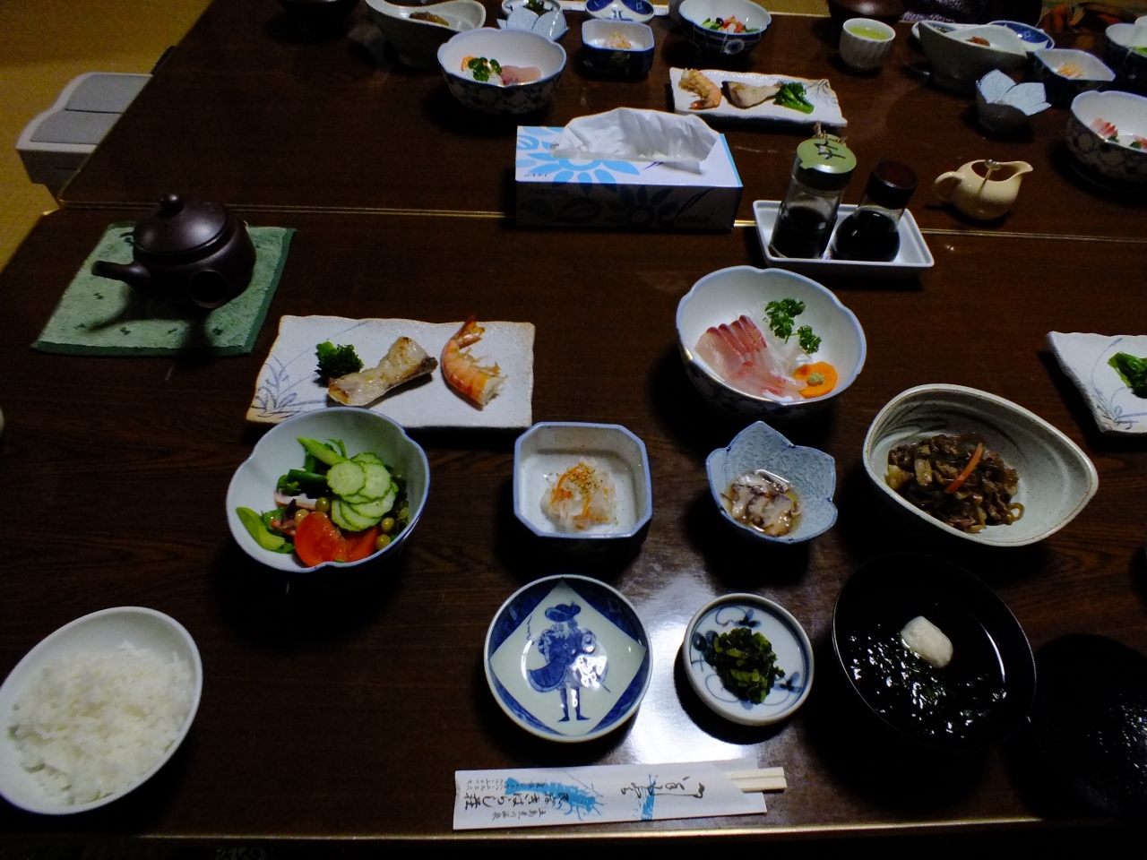 朝夕共、食事は別邸の5Fの食事部屋で頂きます。畳なのですが、低めのテーブルでイスに座って食べるのです。やはり座敷で座って食べるほうがゆったり出来るんですけどね。夕食は皆早めのようで、18:40~にしてもらったら私たちが最後で、ほとんどの方が終わりかけでした。なので、ある意味ゆっくりは食べることは出来き、別注文もさっと聞いてもらえますが、片づけと朝食のセッティングで多少バタバタはしています。