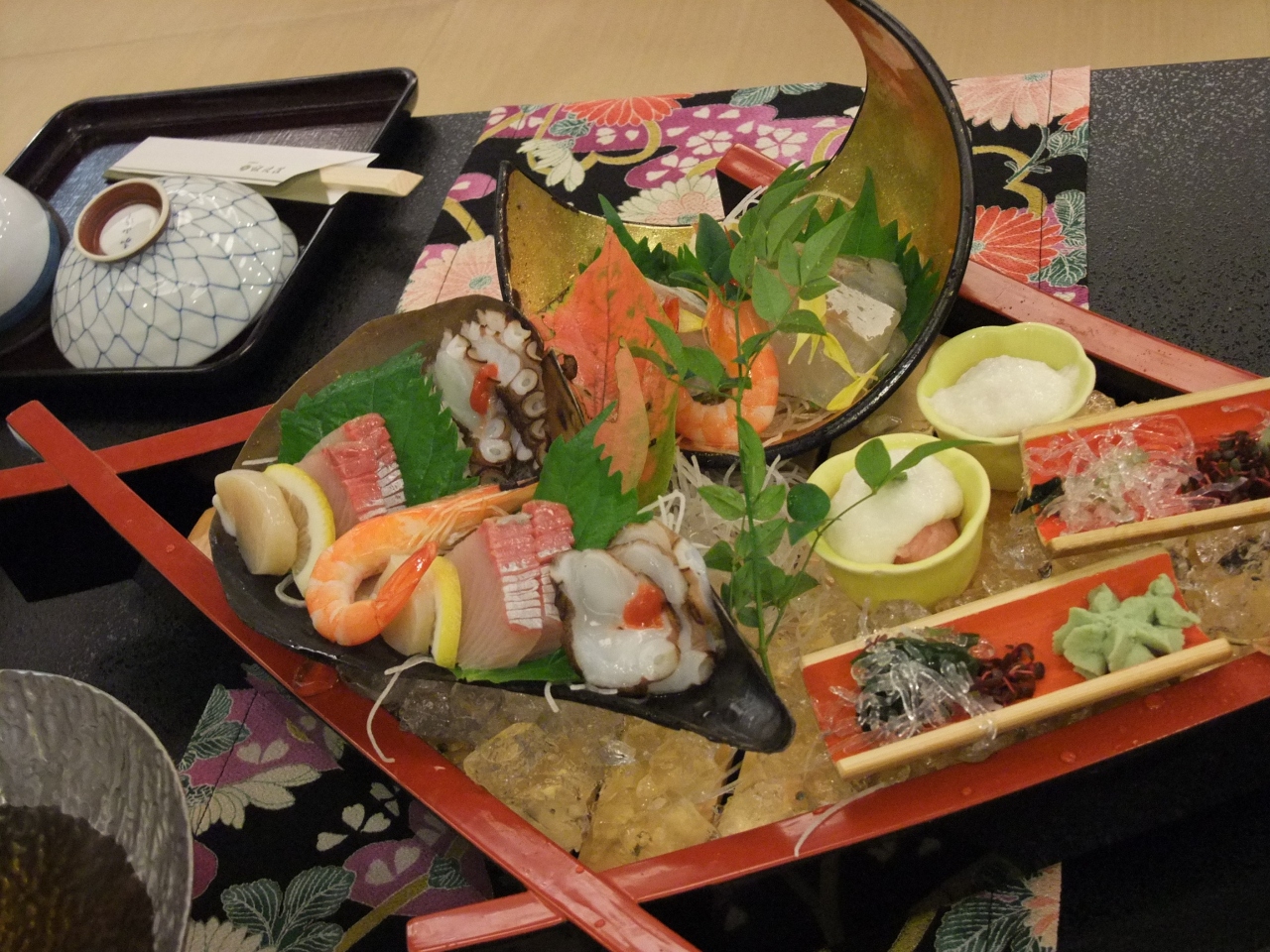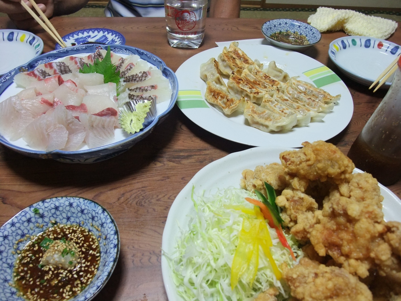 食事は大広間での食事で、新鮮な魚介類と五島牛を使った家庭料理です。魚介類もその日に取れた魚で少々変わるかと思います。