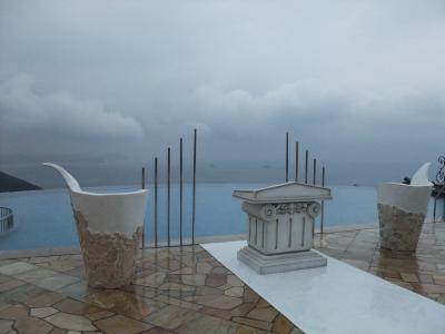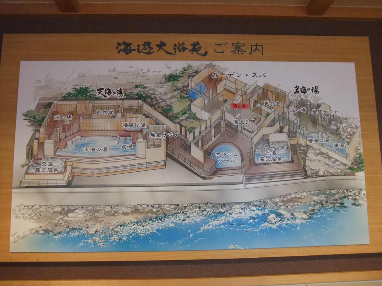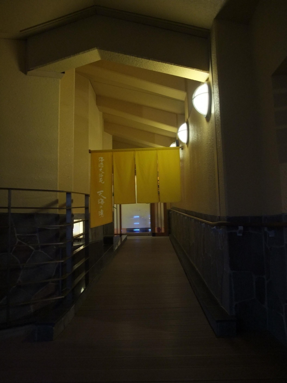 別邸からは3Fまでエレベーターで降りて、廊下を歩き、ピンクのエレベーターで1Fまで行きます。男女入れ替え制で、パンフレットに載っている露天風呂は天海の湯で、夕方は女性用です。こちらの露天風呂は広いです。眺めはとってもよく、ずーっと入っていても飽きないです。