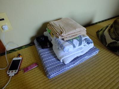 部屋はロフト付きの和室8畳でした。バスタオル、フェイスタオル、歯ブラシ、上下別のパジャマが置いてあります。
