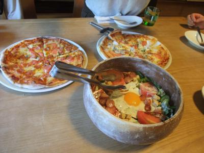 ピザ2種類とサラダを皆でシェアしました。ピザはもちもちしていて美味しかったです。