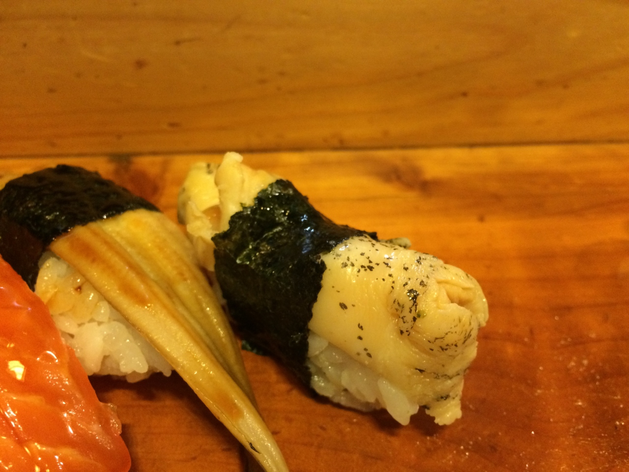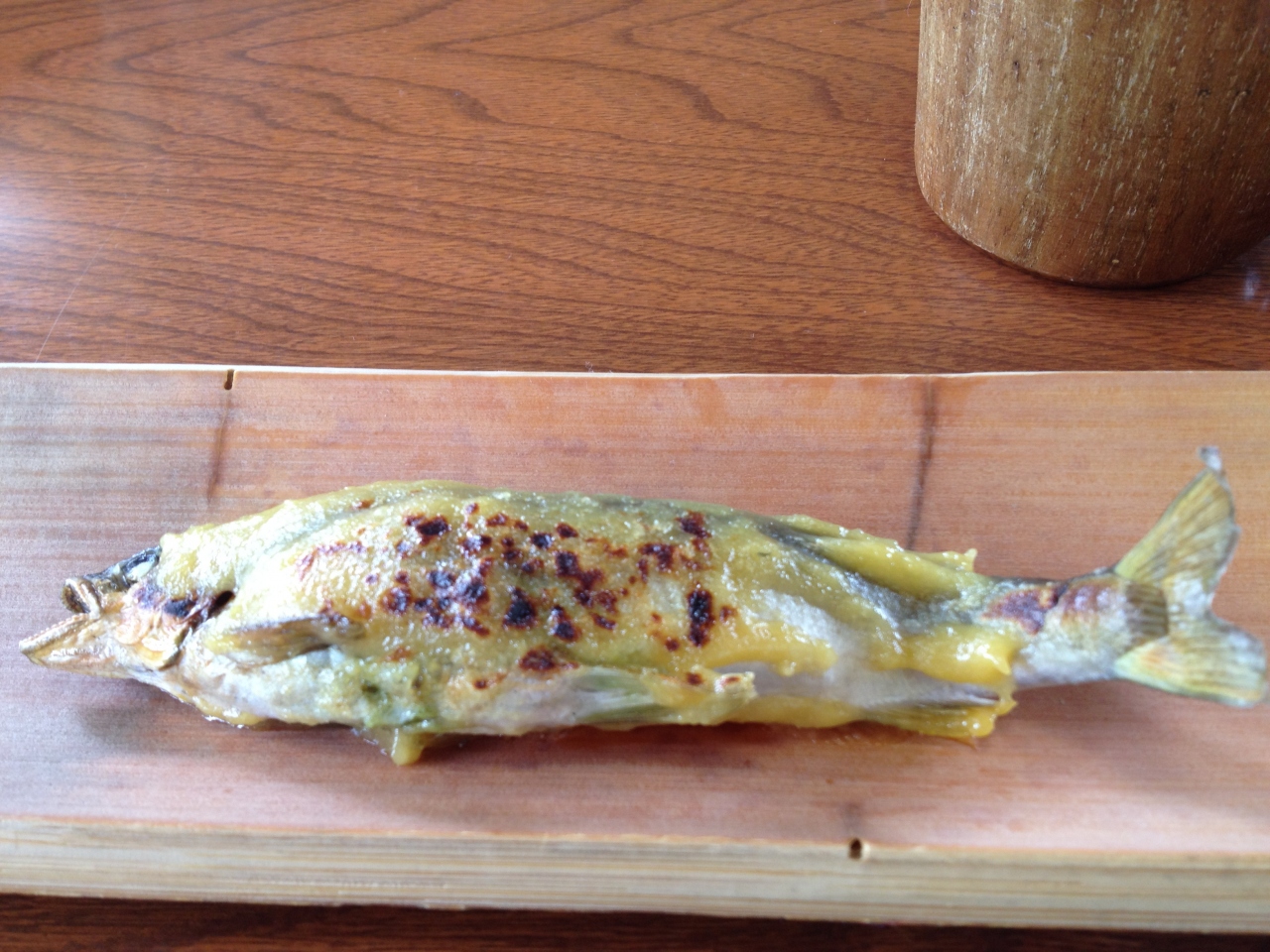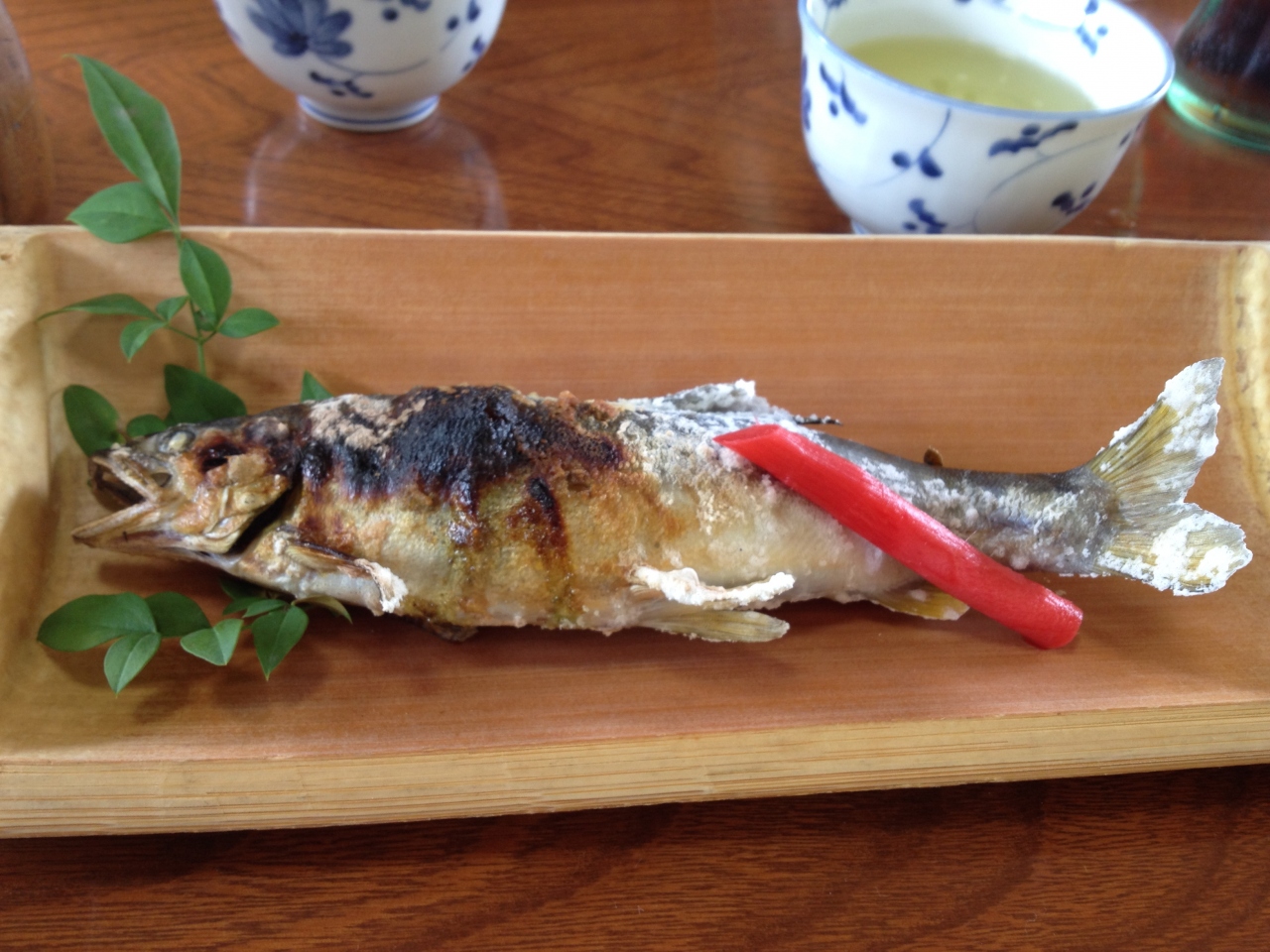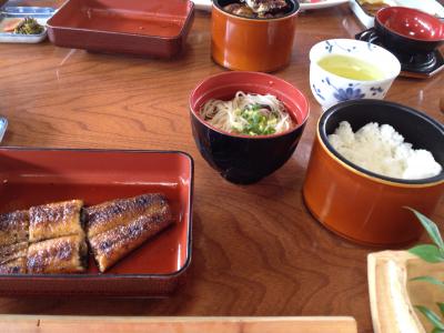 まずはうるか、鮎の刺身、鮎の南蛮漬け、お吸い物と出てきます。その後、鮎の塩焼き、鮎の味噌焼き、そしてうなぎのかば焼き、ごはん、早川ワンコソーメンと出てきますが、塩焼き、味噌焼きは結構待ち時間があり、かば焼きが出てくる際も待ち時間があります。