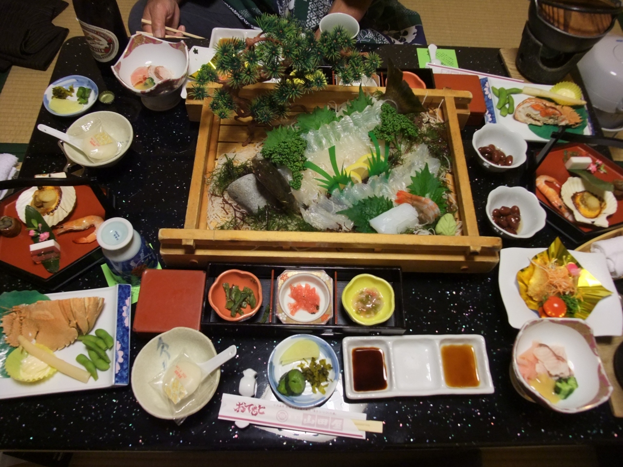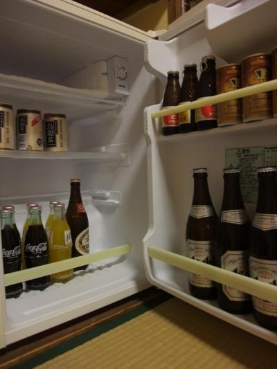 食事は部屋食で、ひらめのお造りプランにしました。海鮮メインで色々と沢山品数が出てきます。食べ切れるかなーと思ったのですが、意外とちょうどいい量だったりする。ドリンクは焼酎は冷酒は持ってくるのですが、ビールは「冷蔵庫から」ということで、部屋の冷蔵庫から取り出す形でした。