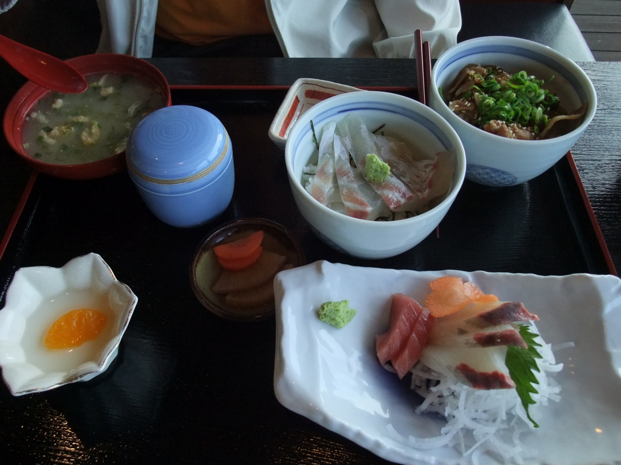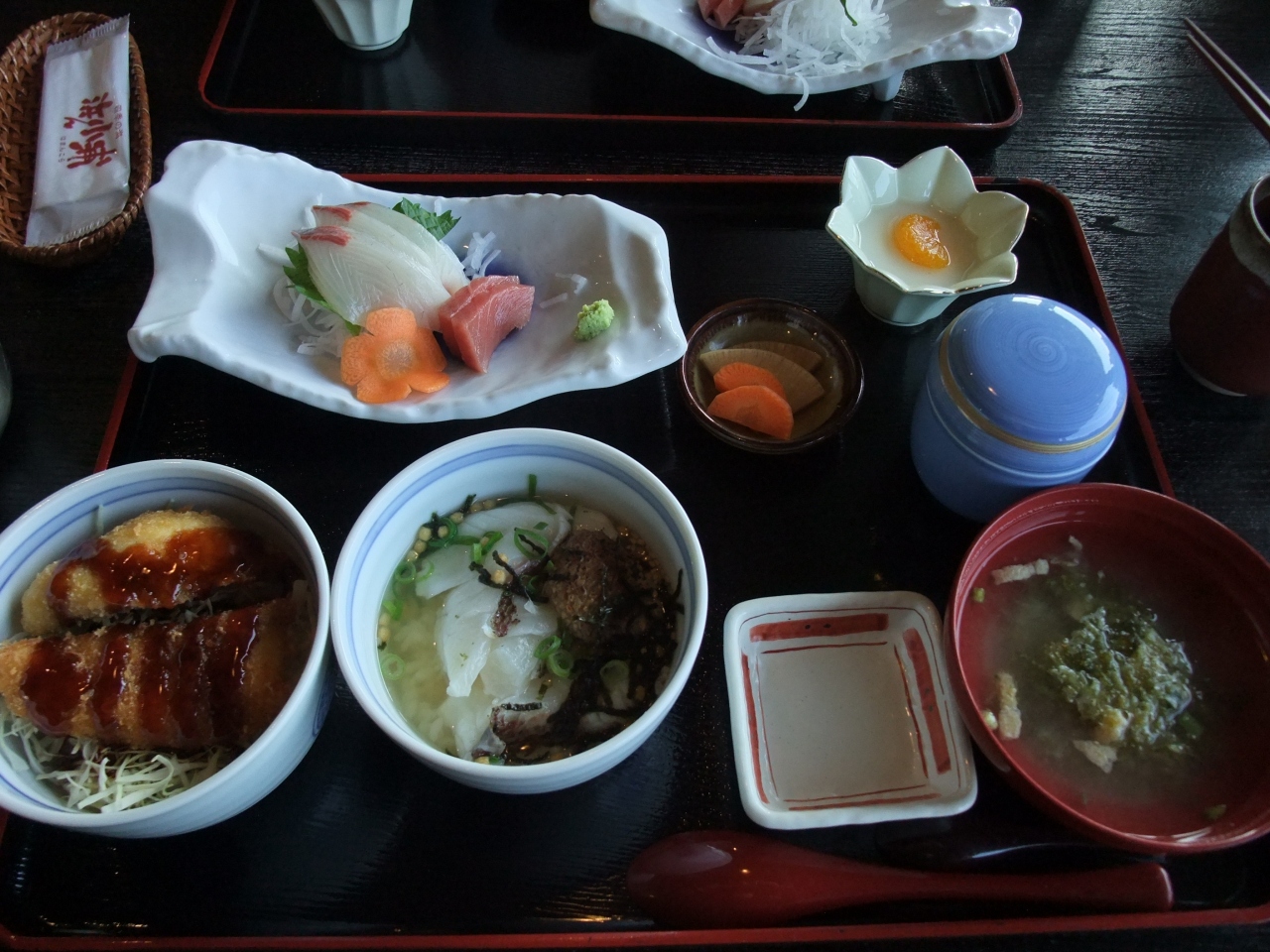 どんぶり二種類、味噌汁、茶わん蒸し、刺身、デザート(杏仁豆腐)。