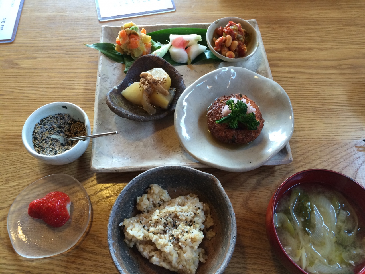 12時頃に行った時は閑散としていました。お値段がちょっと高いかなーという感じもあったんで、人が入らないのかなーと思っていたんですが、13時あたりからじょじょに増えてきました。仕事の昼休憩で来ている方もいますが、ワンプレート、野菜を使った、ヘルシーというフレーズのためか9割方女子。そして学生率が高い。というのも、この建物には図書館もありますが、学習室というものあって学生が勉強しに来ているからです。