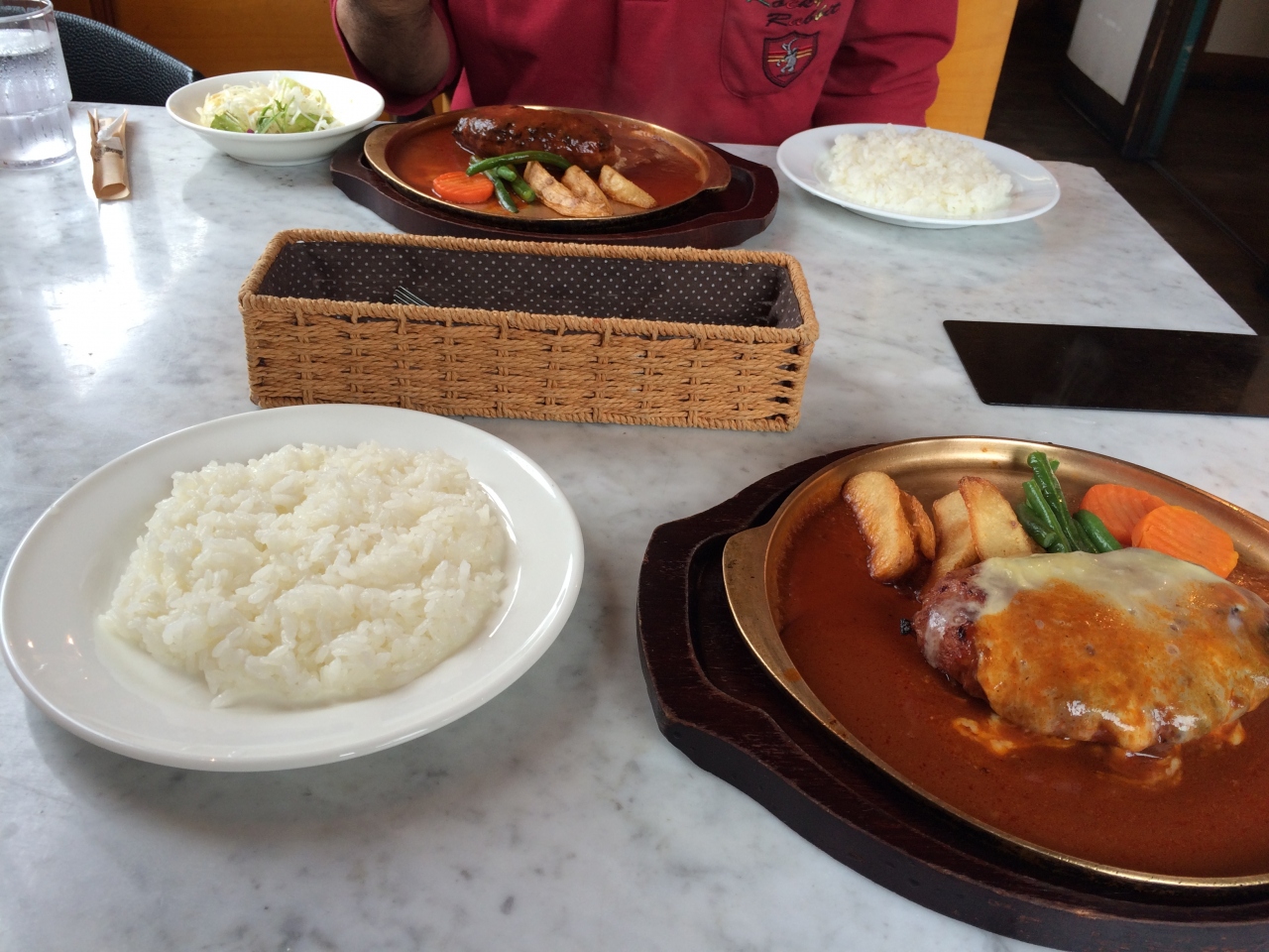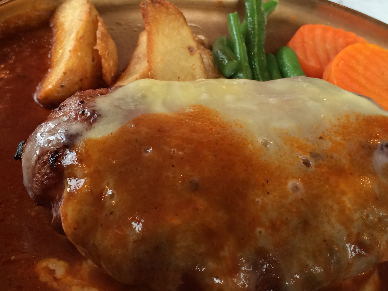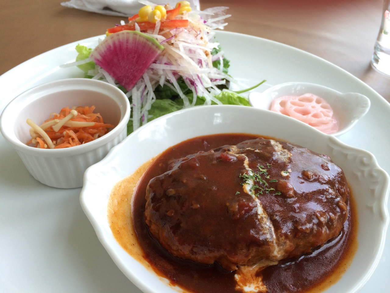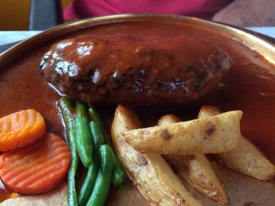 ジューシーなハンバーグをいただけます。「おっ」と思ったのは付け合せの野菜にソースが流れないようにかけているところ。