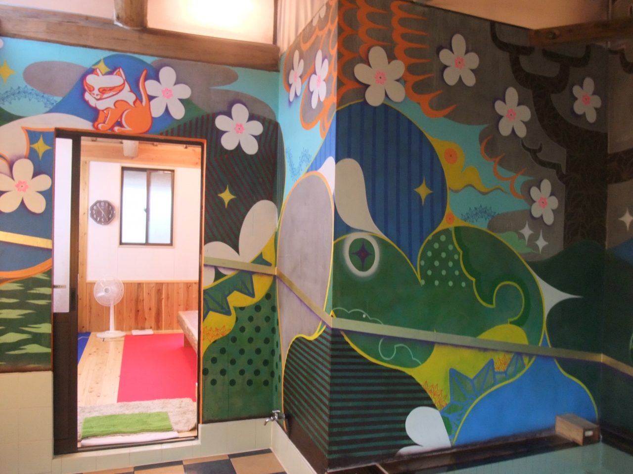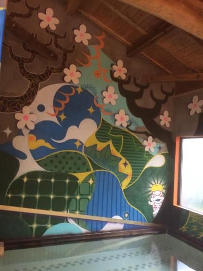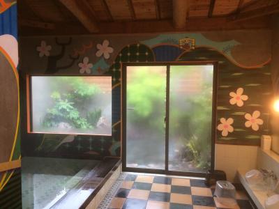 お風呂はかけ流しで、男女入れ替え制です。アートの宿ということでどこがアートなんだろーと思っていましたが、お風呂がアートでした。