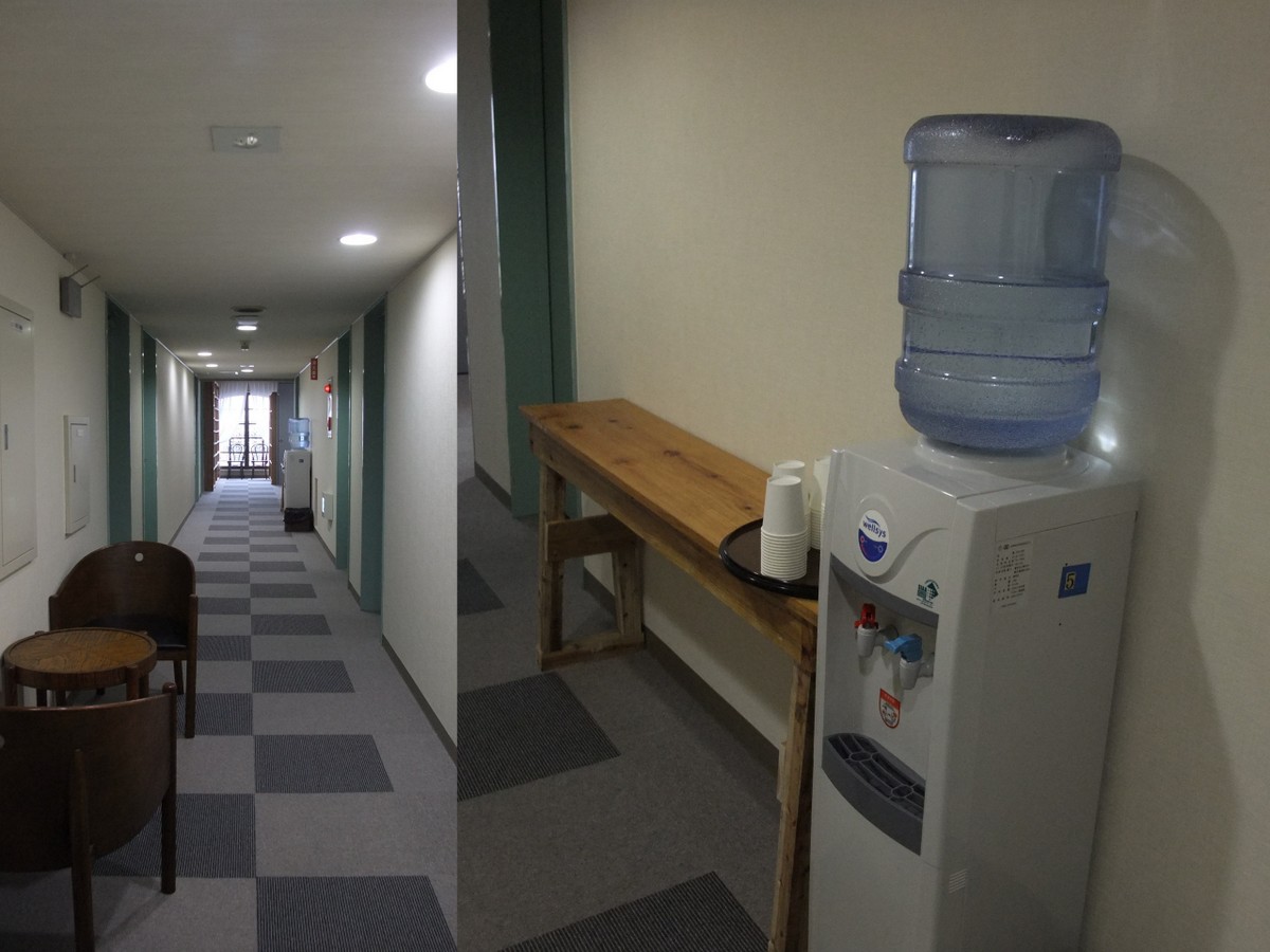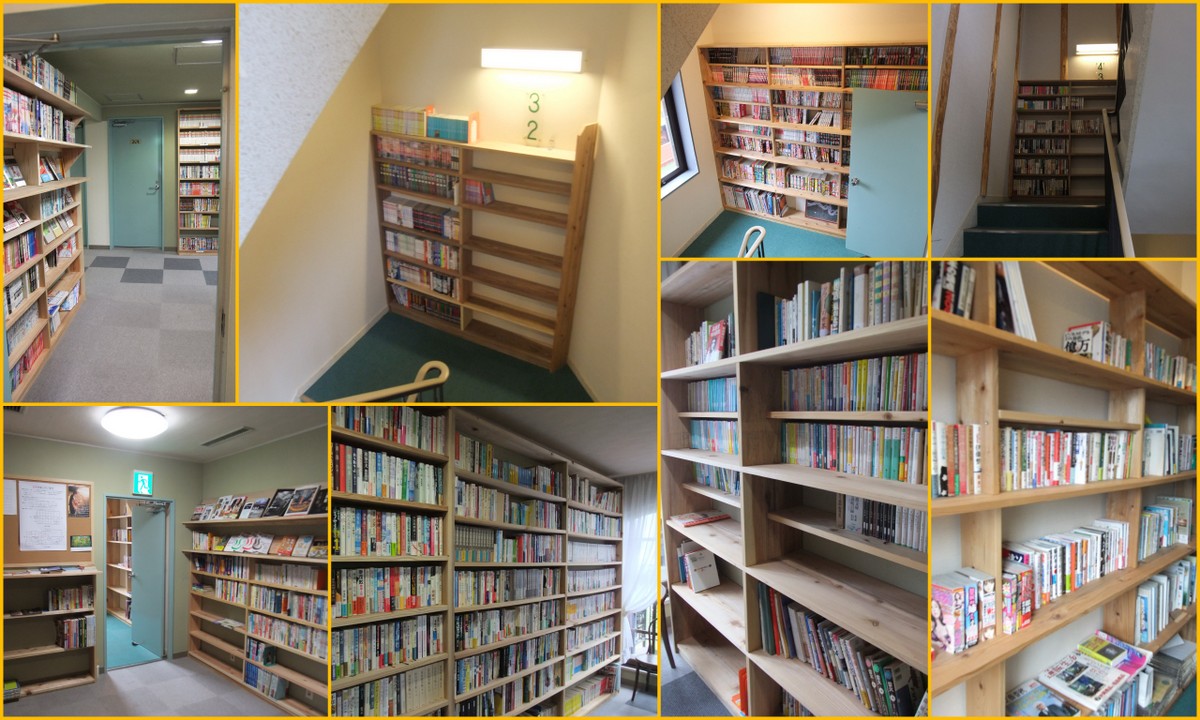 客室はいたって普通のビジホです。トイレとバスルーム/洗面台は独立しています。延長コードがあったのは便利です。また各階にサーバーが置いてあったので、いちいち別の階へ行く必要もなく便利でした。そして、各階、階段の踊り場に本棚が設置してあり、たっくさんの本が置いてあります。