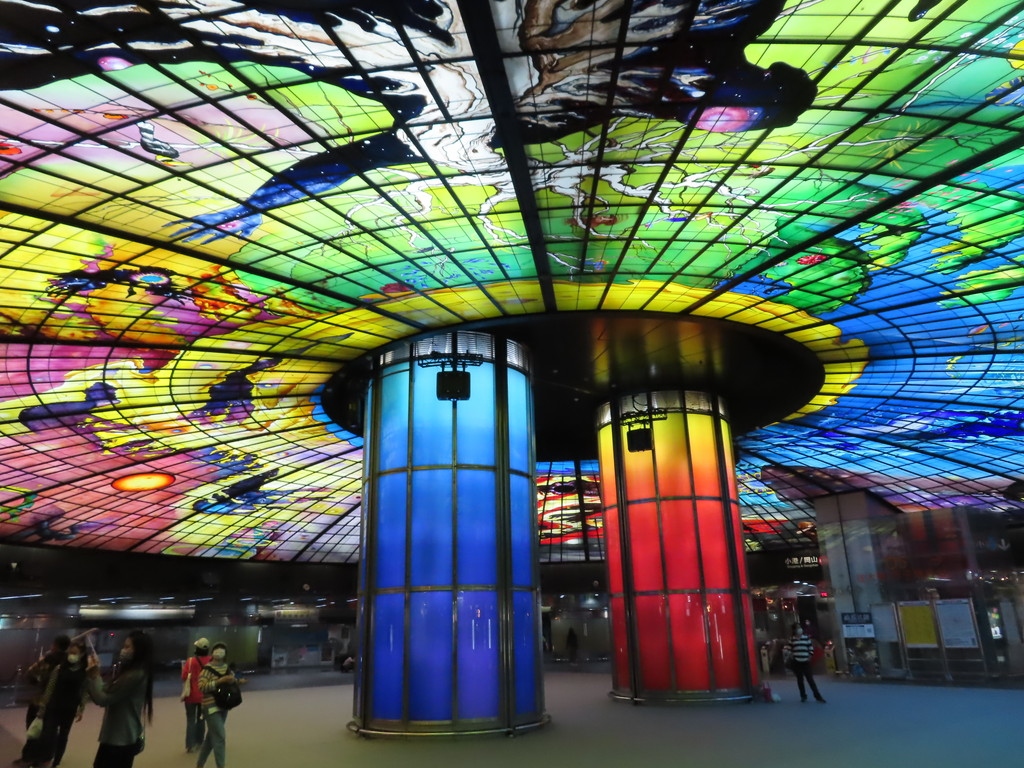 高雄捷運美麗島駅の改札口の手前には有り、天井や柱はステンドガラスに覆われて美しいです。ここに来るたびに、ついついデジカメで写してしまいほど素晴らしいと思います。今日も、若い女子学生たちが、座り込んで、撮影をしていました。構内の景色は、色々変わっていきますが、ここだけはいつまでも変わりません。