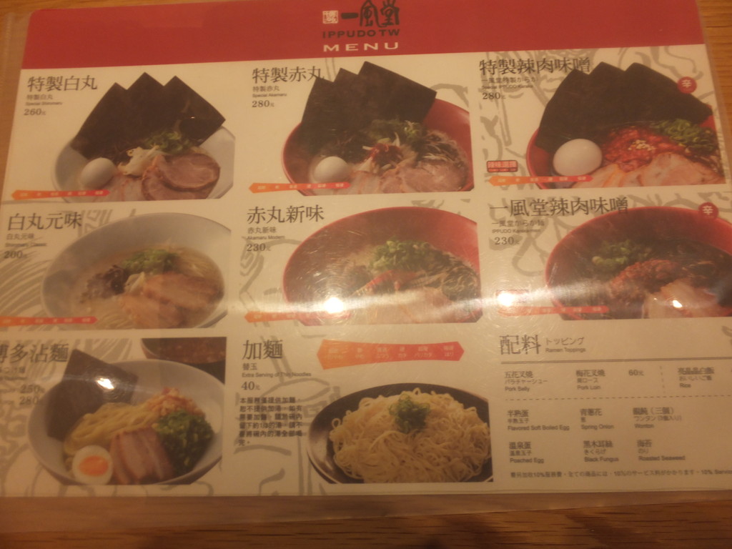 友人の家族、妻と高雄の漢神巨蛋会館にある一風堂へ行ってみました。セットメニューもありましたが、単品を頼むことにしました。私は豚骨ラーメン(特製白丸:260元、約800円)妻は一風堂辣肉味噌、友人たちは赤丸新味、博多つけ麺、カレー味を注文。まあまあ美味しかったですよ。麺もそれぞれ違う麺を出していました。豚骨はストレート麺、つけ麺はふと麺、その他は縮れ麺でした。流石です。残念なのは、日本のようにラーメンが熱くないのです。日本のようにどこへ行っても熱いラーメンは食べれないように思いました。