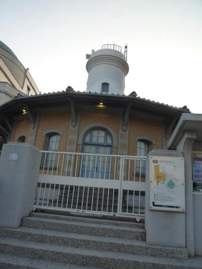 歴史を感じる薄茶色の建物の上に、気象台らしく白い円筒の建物がありました