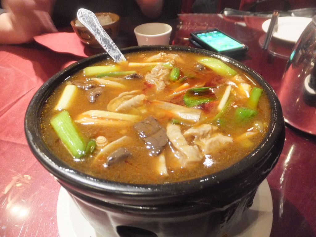 劉家酸白菜火鍋は、中国北方地方のキャベツの古漬けをベースにした酸っぱい鍋です。材料はキャベツの古漬けのほか、白肉(豚ばら肉:これが美味しい)、揚げた湯葉、高野豆腐、魚の団子などです。淡白ながら、スープに深みがありなかなかの味です。タレはお好みでトッピング。このスープの他に、必ず注文するのがのが牛肉捲餅(これは絶品ですよ。タレにつけて食べると更に美味しい)、お腹の空き具合によって小龍包を注文しますが今日はしませんでした。小皿料理はパーツアイ他2点を取りました。お会計は3人で800元はしませんでした。小龍包を頼んでも一人1000円で収まります。