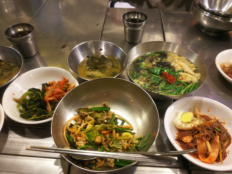 麦めし(ビビンバ)を注文したら、ミニビビン麺やカルグッスなど次から次へと出てきます。