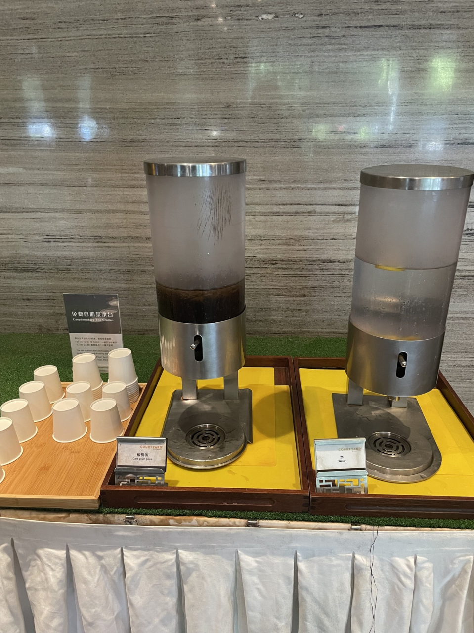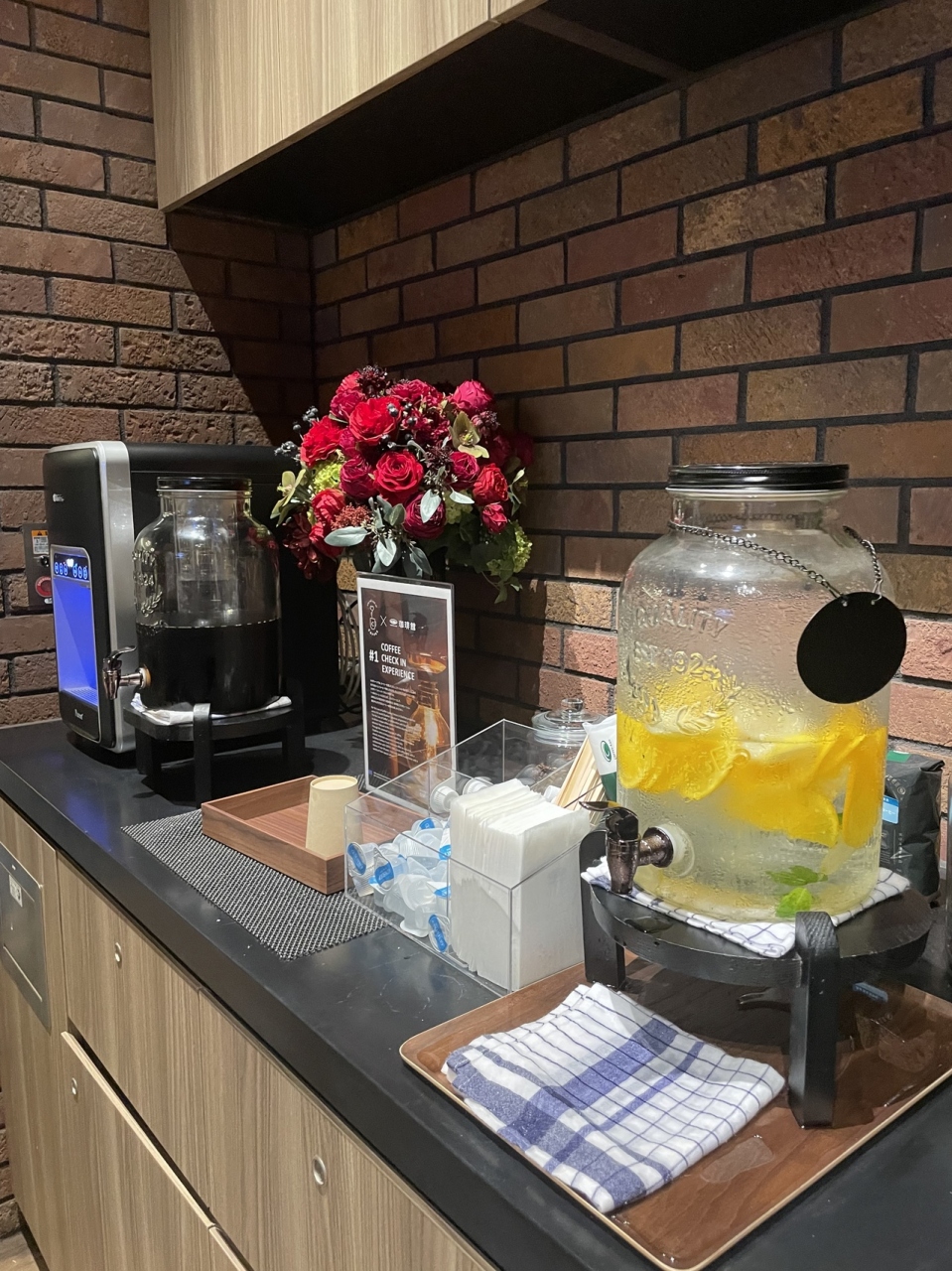 1階のロビーラウンジにはアイスコーヒー、レモン水、水などがありましたが、紙コップの補充がされておらず飲めない・レモン水が空っぽで飲めないなどが違う時間の利用時にあり残念でした。