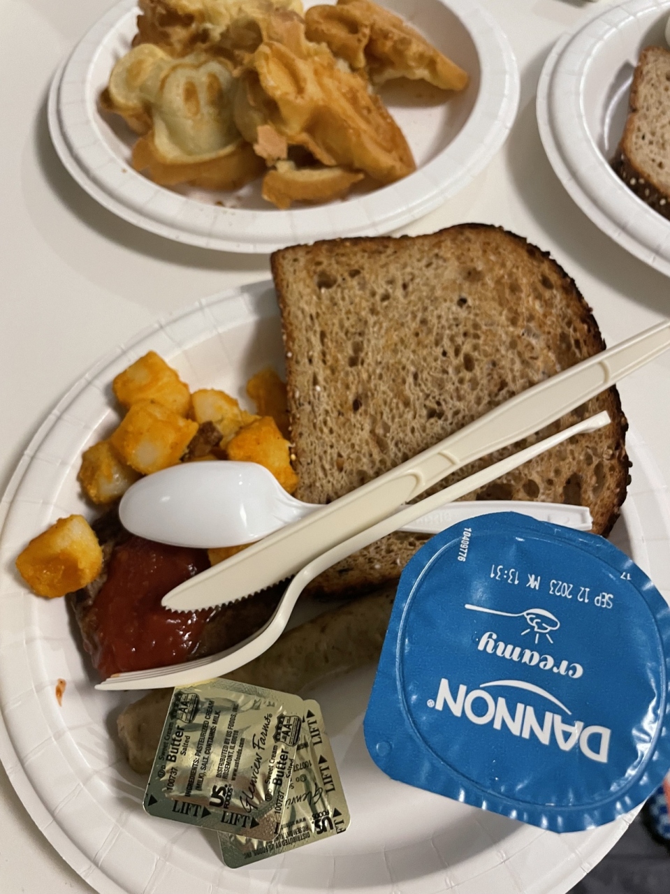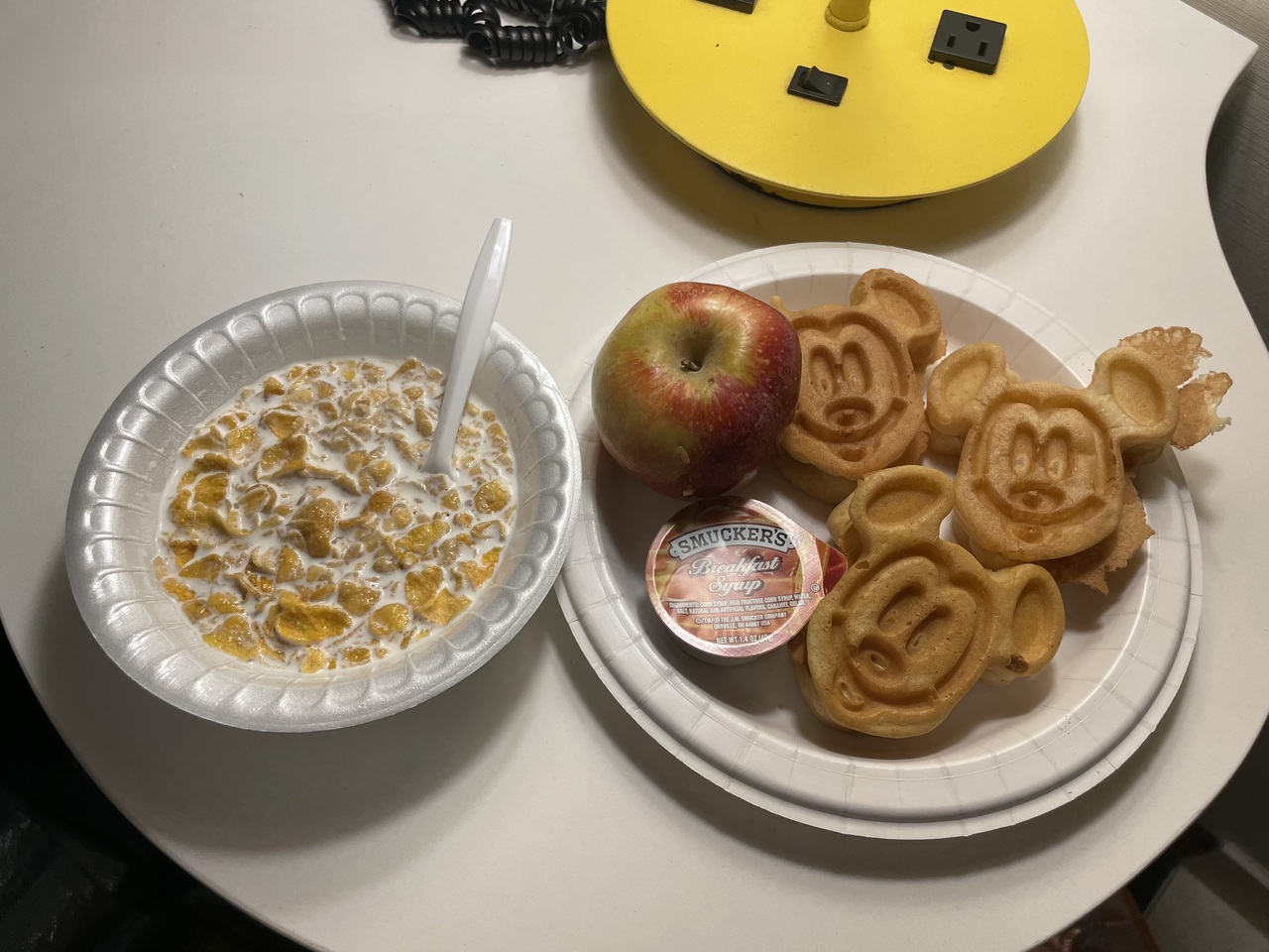 大人数で一部屋に泊まれ、宿泊者全員朝食無料もありがたい。自分で焼き上げるミッキーワッフルや、シリアル各種パン、ウインナー、ポテト、卵料理、バナナ、りんご、ヨーグルトなどあり。朝食会場でも部屋に持ち帰って食べてもOK。