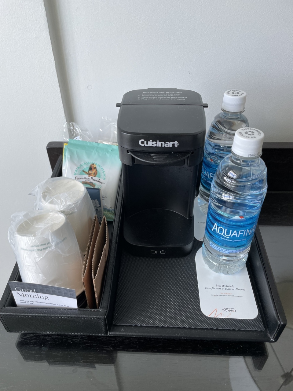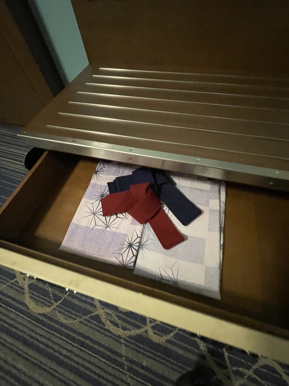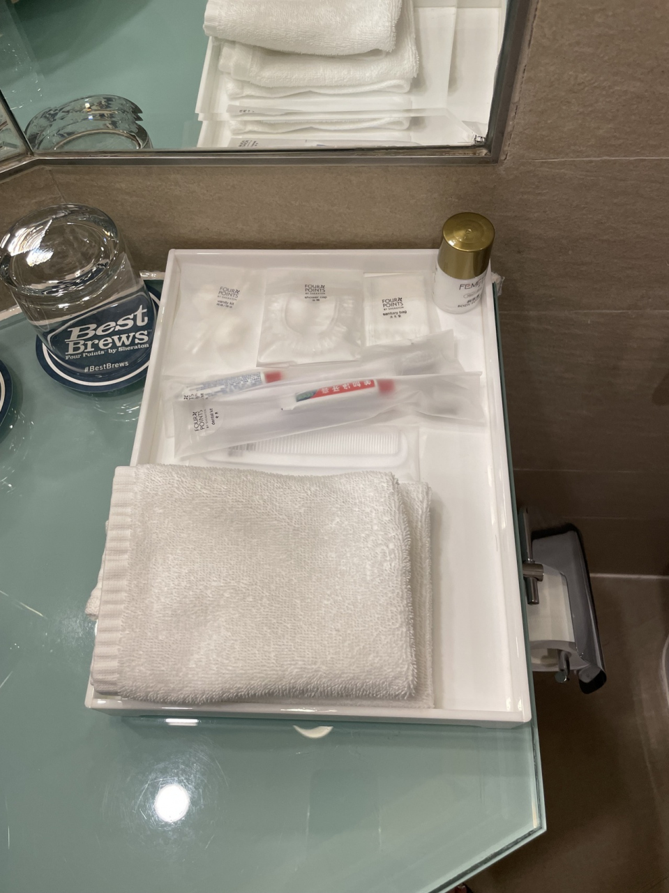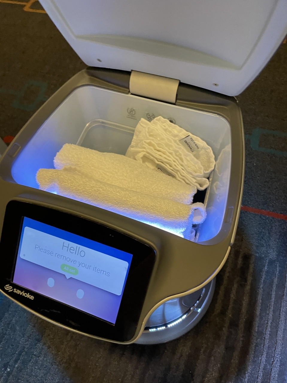 マリオット公式アプリから5名で予約しているのに、バスタオル・フェイスタオル・ミニタオルがいくら探しても3名分しかない為、公式アプリのチャット機能を使って不足2名分のタオルが欲しい旨を伝えるとすぐに返信あり。次に電話が鳴って出るとロボット音が…ドアを開けるとロボットがタオルを届けてくれました。これには娘が大喜び!
