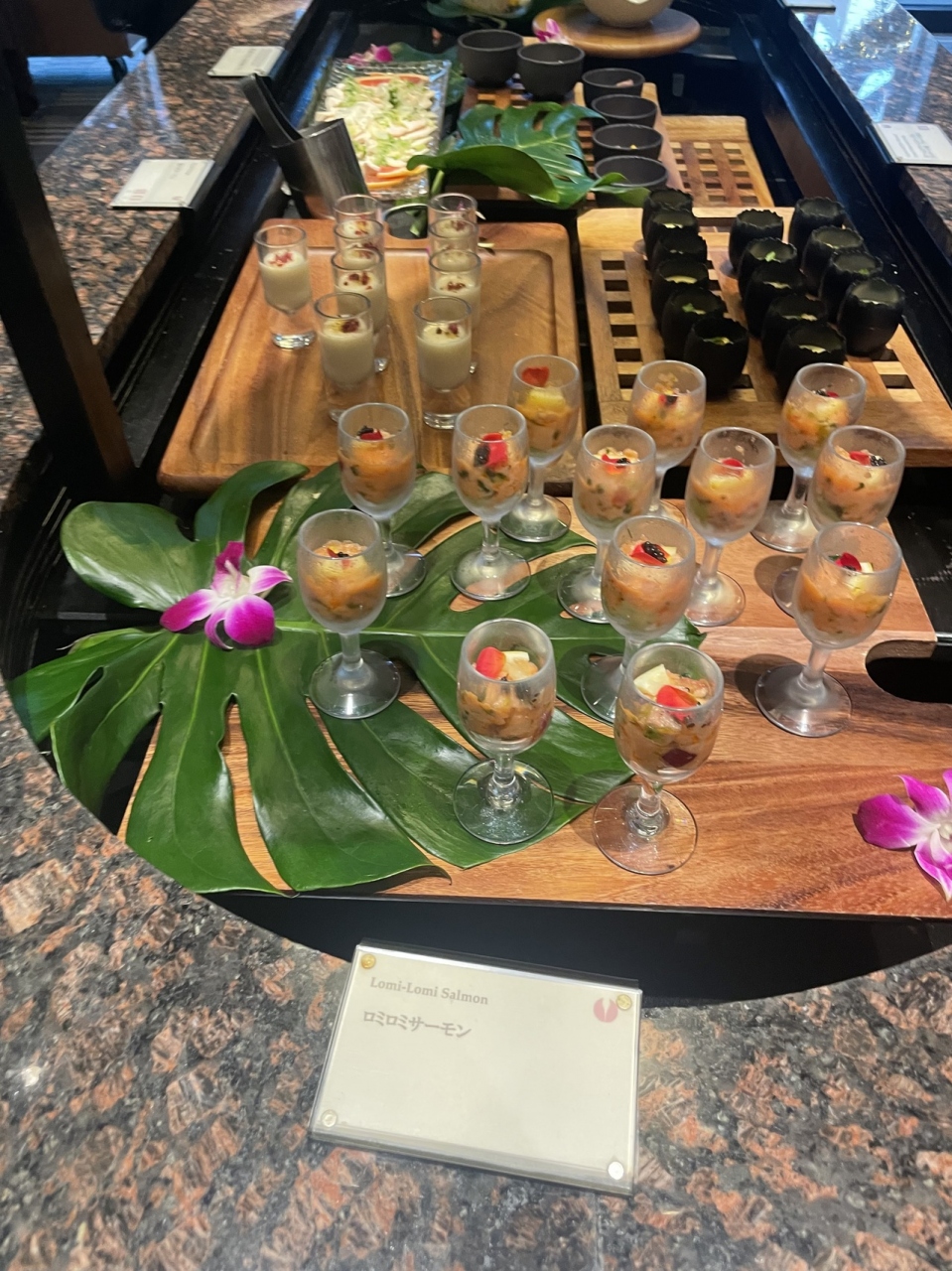 鮑・フォアグラ・ローストビーフ・前菜各種・揚げ物・寿司・すき焼き・しゃぶしゃぶ・エスニック系・デザートと充実していました。