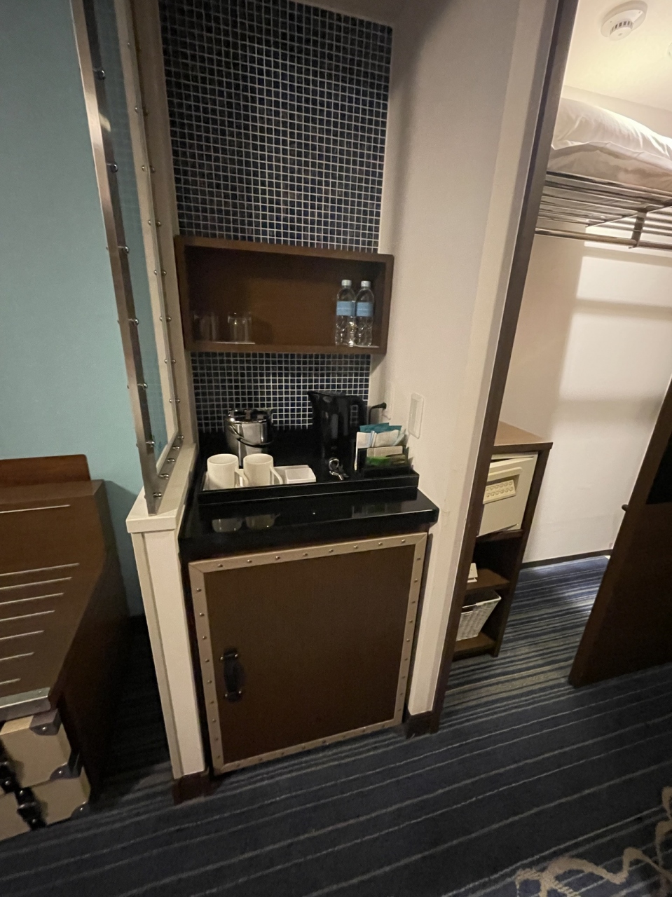 水は部屋に備え付けのピッチャーを持って7階のラウンジに行き入れる方式。