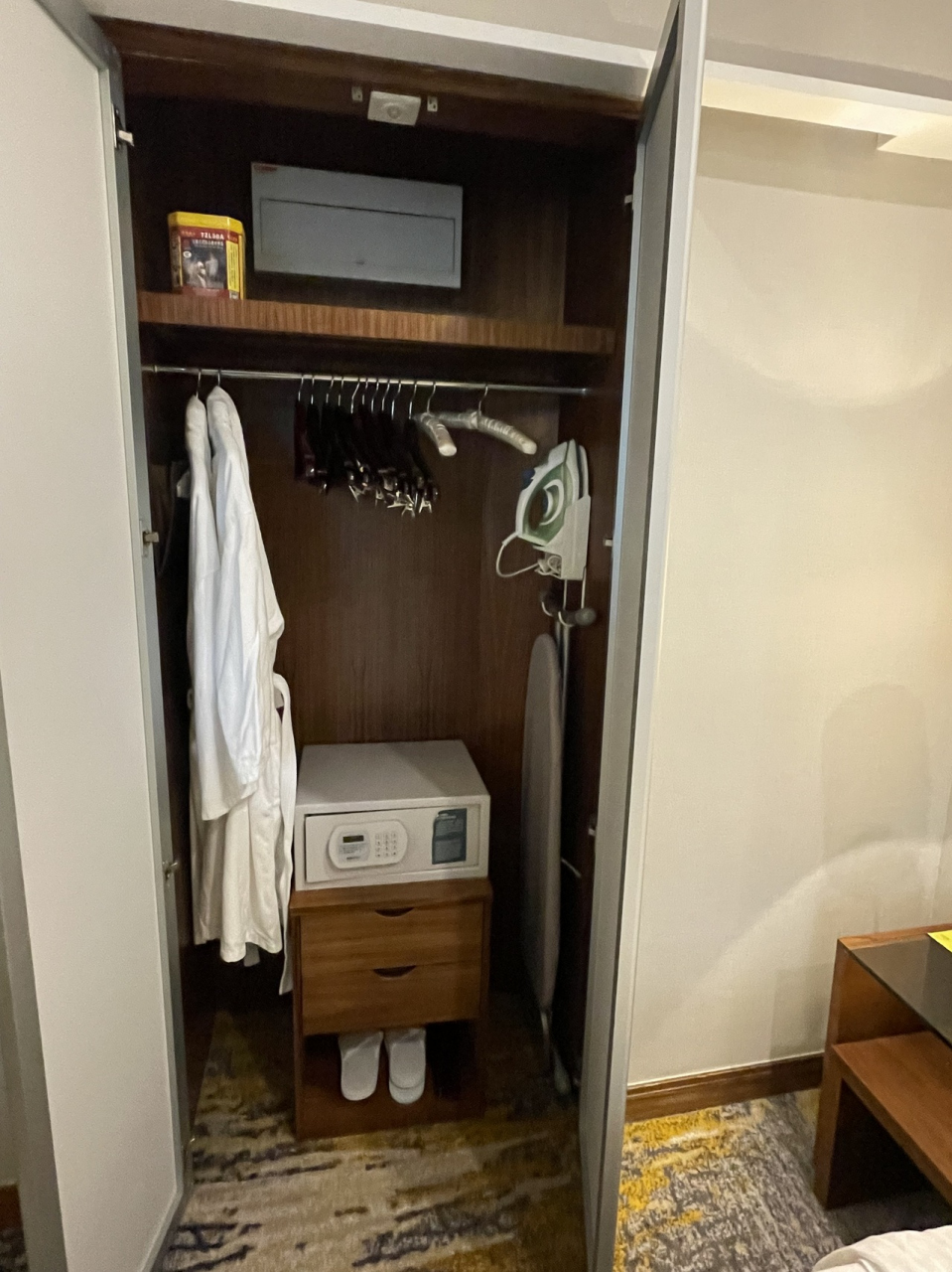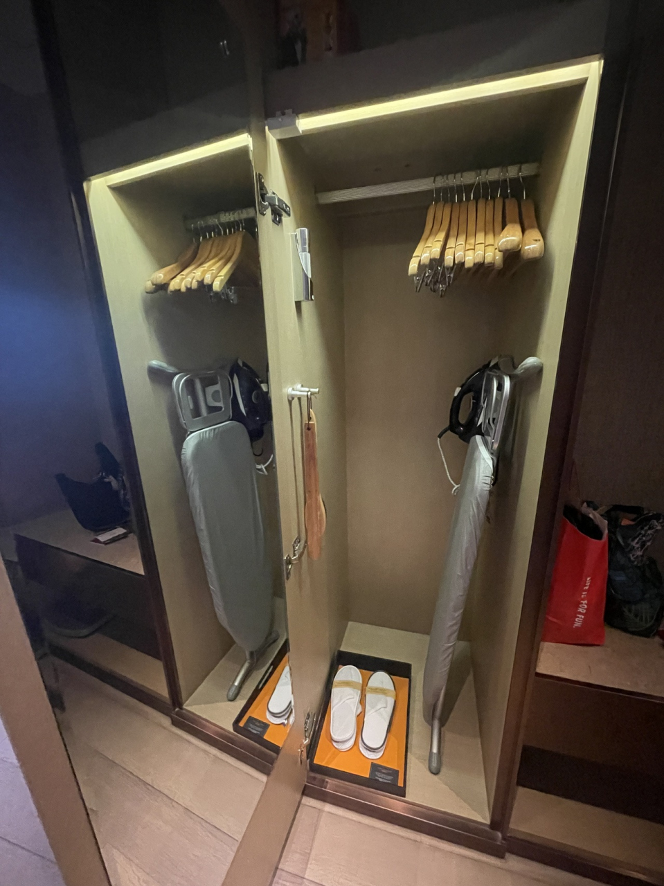 客室は広く、アメニティ類、水、スリッパ、バスローブ、アイロンなどもあり快適。