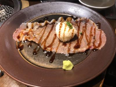 厚切りタンTカット、カルビ、ハラミ、ヒレの湯引きユッケ、サーロイン1枚握り、4代目トラジサラダ、名物冷麺、タンつくね、ライス、お酒、フォンダンショコラなどをオーダー。