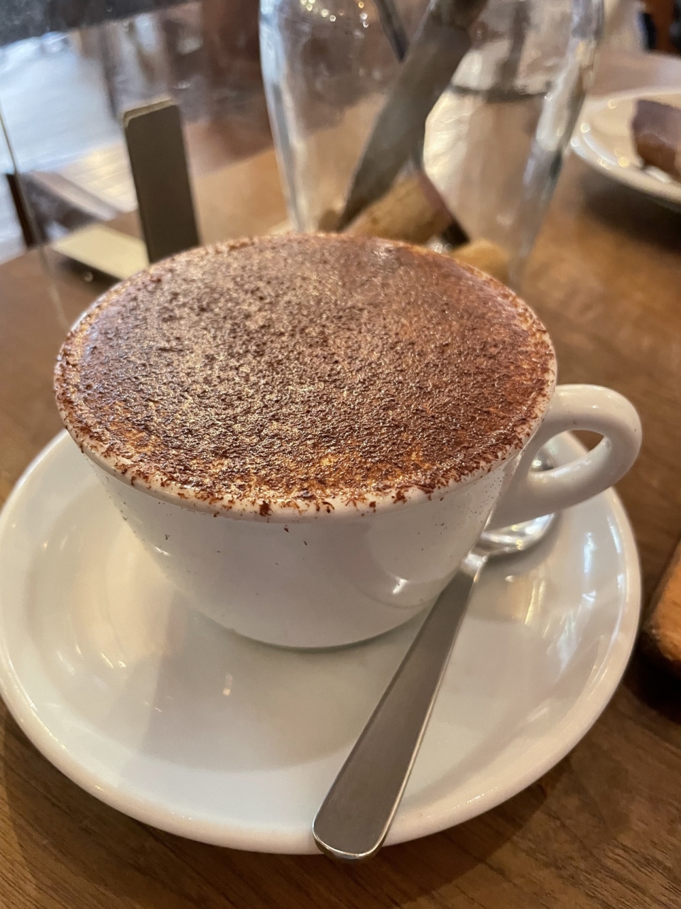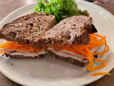主人は自家製ハムのサンドイッチ(パンは全粒粉のくるみパンをチョイス)とトーストバタートッピングとキャラメルカプチーノをチョイス。サンドイッチのパンは選べるところが嬉しい。