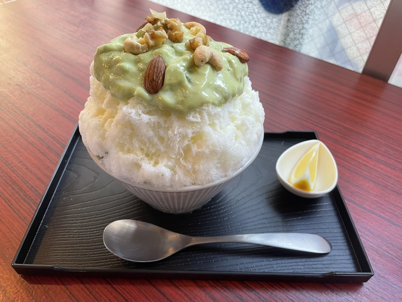 アボカドナッツは練乳がたっぷりかかった氷に特製アボカドソースとナッツ類がのっている。「よかったら途中でレモンをかけてお召し上がりください」とのこと。練乳にアボカド?それって合うの?と思ったが、人気メニューのため、ちょっとドキドキして口に入れると…おいしい!はじめて食べるアボカドかき氷。美味しかった。宇治金時はお茶屋さんの方が美味しかったな。