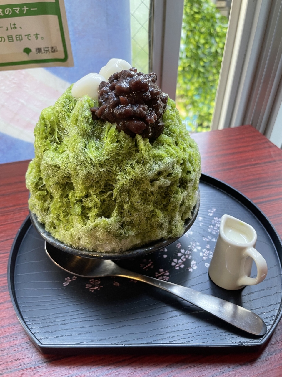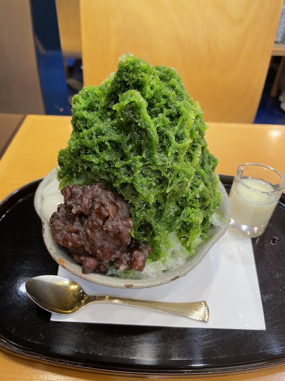 後から隣の席にいらしたおばさまも宇治金時をオーダーし、「コンデンスミルクをたくさんお願い」とおっしゃっていた。すると、たっぷり練乳がかかってる上に別盛りもいただけていた。