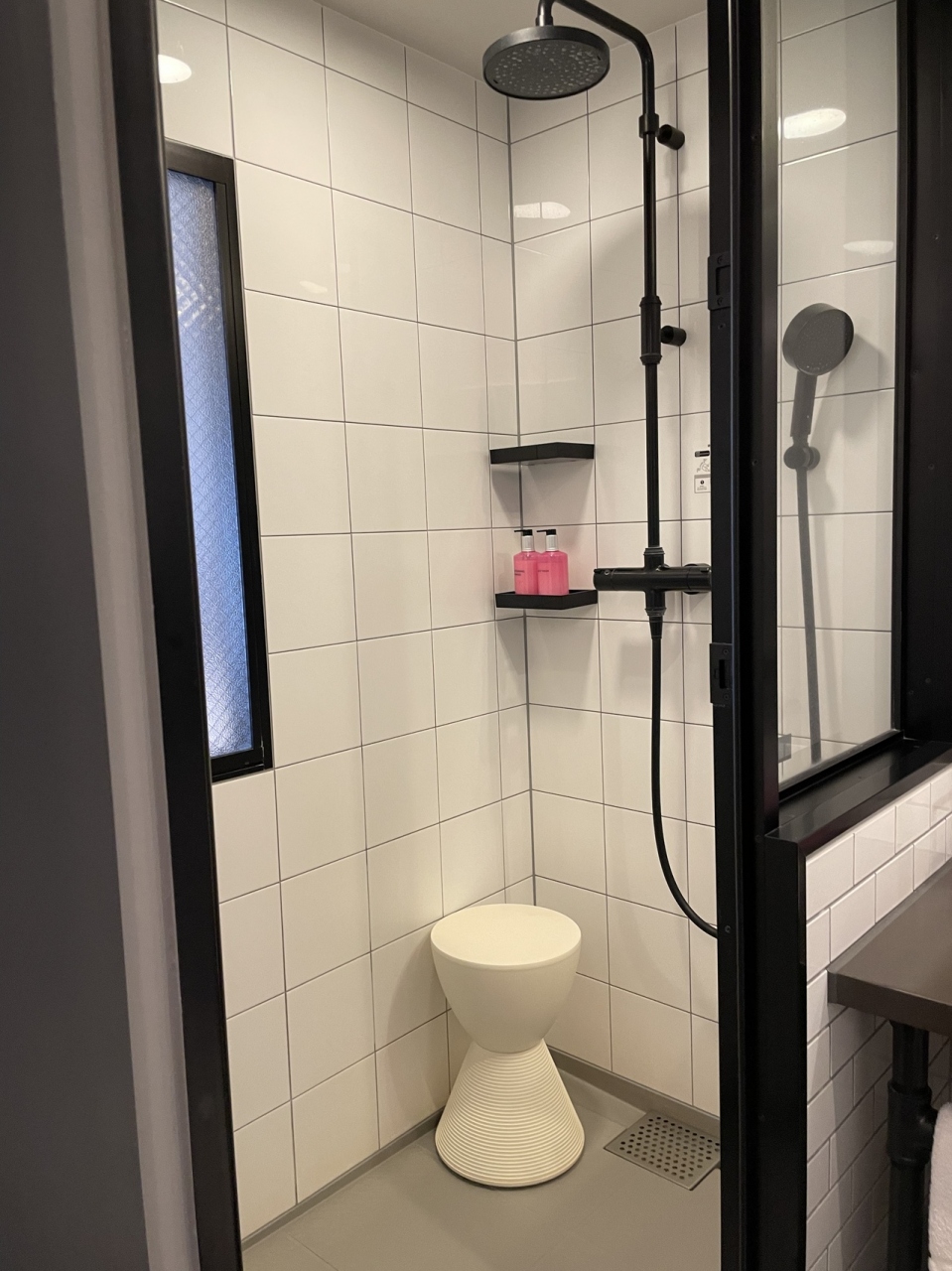 湯船は無くシャワーのみ。レインシャワーとハンドシャワーあり。背の高い椅子が使いやすかった。