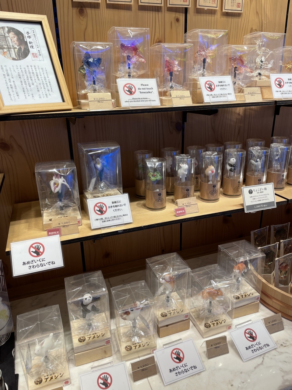 細かい丁寧な作業で作られた綺麗な飴細工が並んでいて目を引いた。時間によって職人さんによる実演もあるようだった。日本人はもちろん、外国人観光客が増えてきたら喜ばれると思う。(ポケモンセンターの目の前だし)