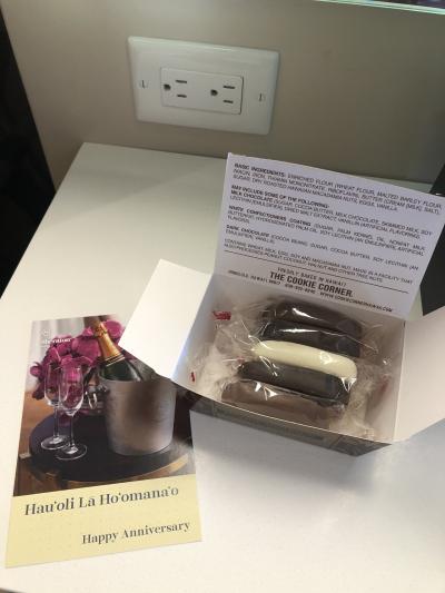 3年我慢して待ち焦がれたハワイ!ワイキキでは1泊だけでも海とダイアモンドヘッドを見れる部屋に泊まりたく、旅行記やYouTubeを参考にし、シェラトンワイキキのデラックスオーシャンフロントルームを予約しました。宿泊1週間前にシェラトンからメールが届き、滞在の理由なども聞かれた為、記念日について記入するとお祝いメッセージとクッキーをいただきました。