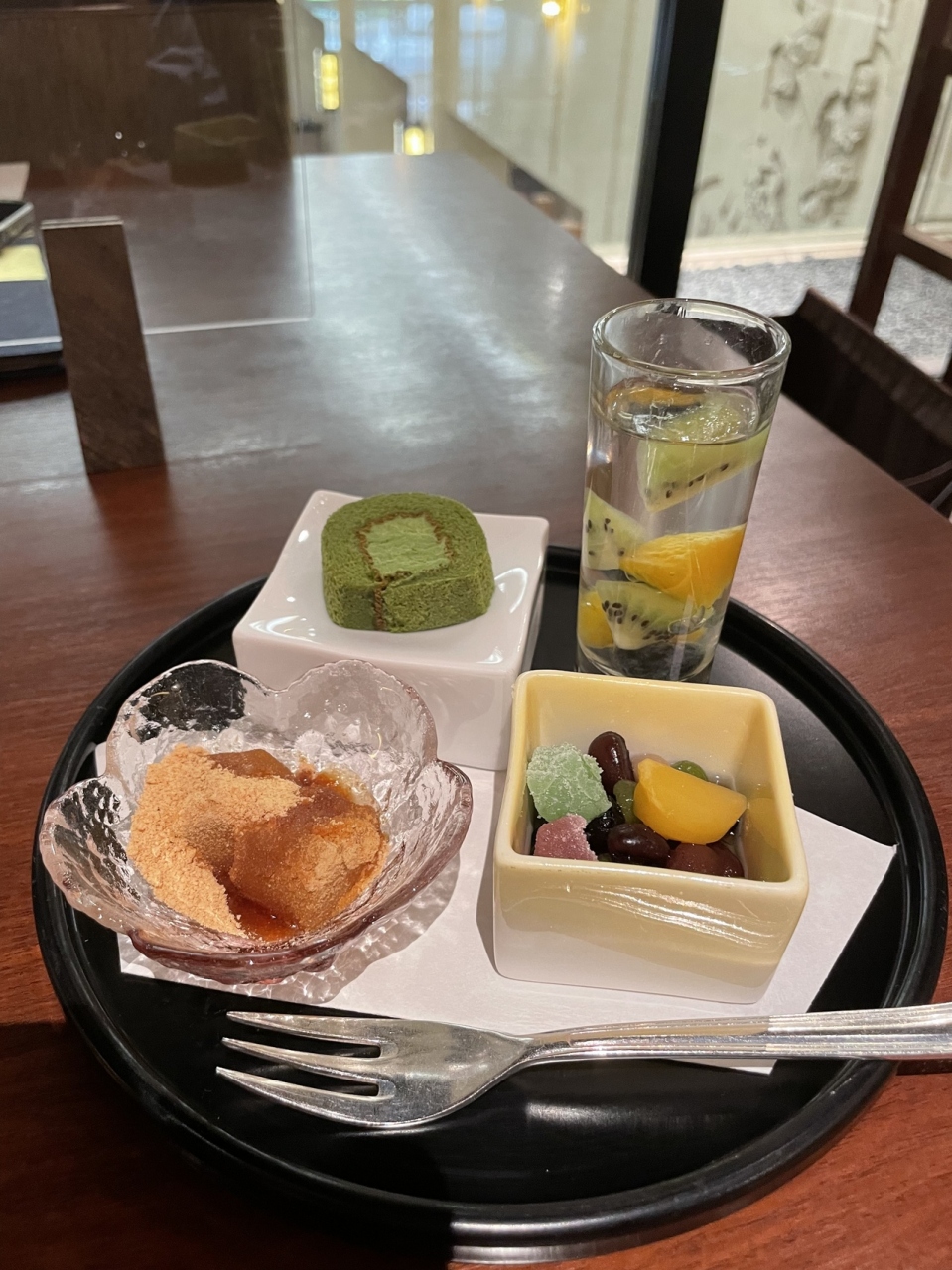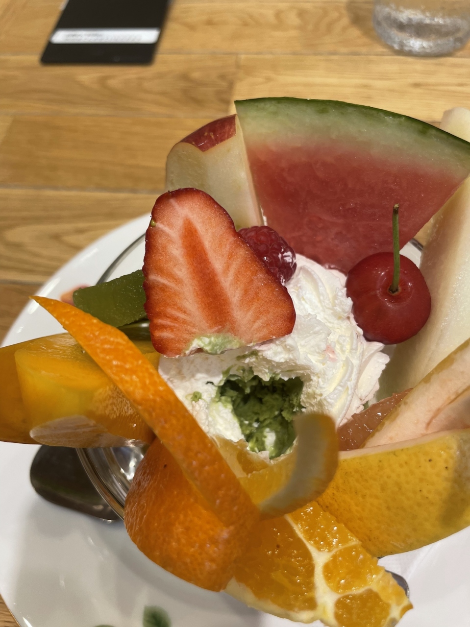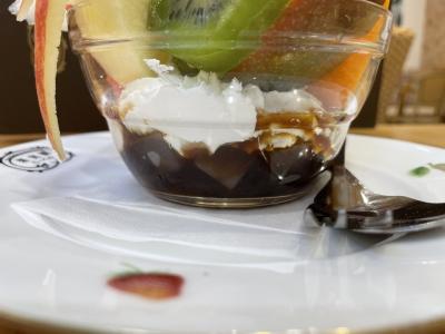 美味しいフルーツが数種類と寒天、黒蜜、小豆、クリーム入りで重いかと思ったがサラッと食べることができた。