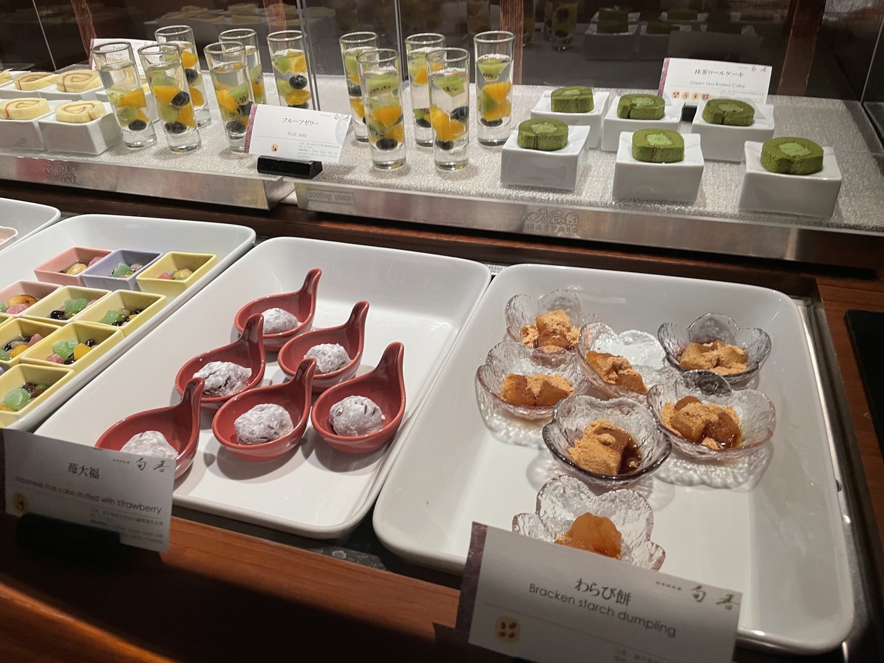 わらび餅、抹茶ロールケーキ、みつ豆、フルーツゼリー、いちご大福、桜プリンなど。
