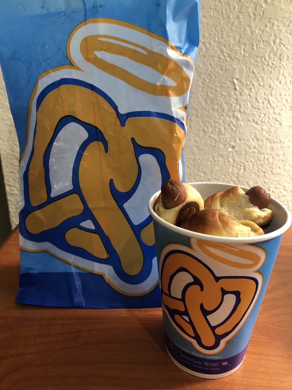 アラモアナショッピングセンター1階フードコート内にあるシナボンと併設されているAuntie Anne’s(アンティアンズ)。ウインナー入りのミニサイズをロサンゼルスで購入した際、朝食などに重宝したため、今回も同じものを購入。