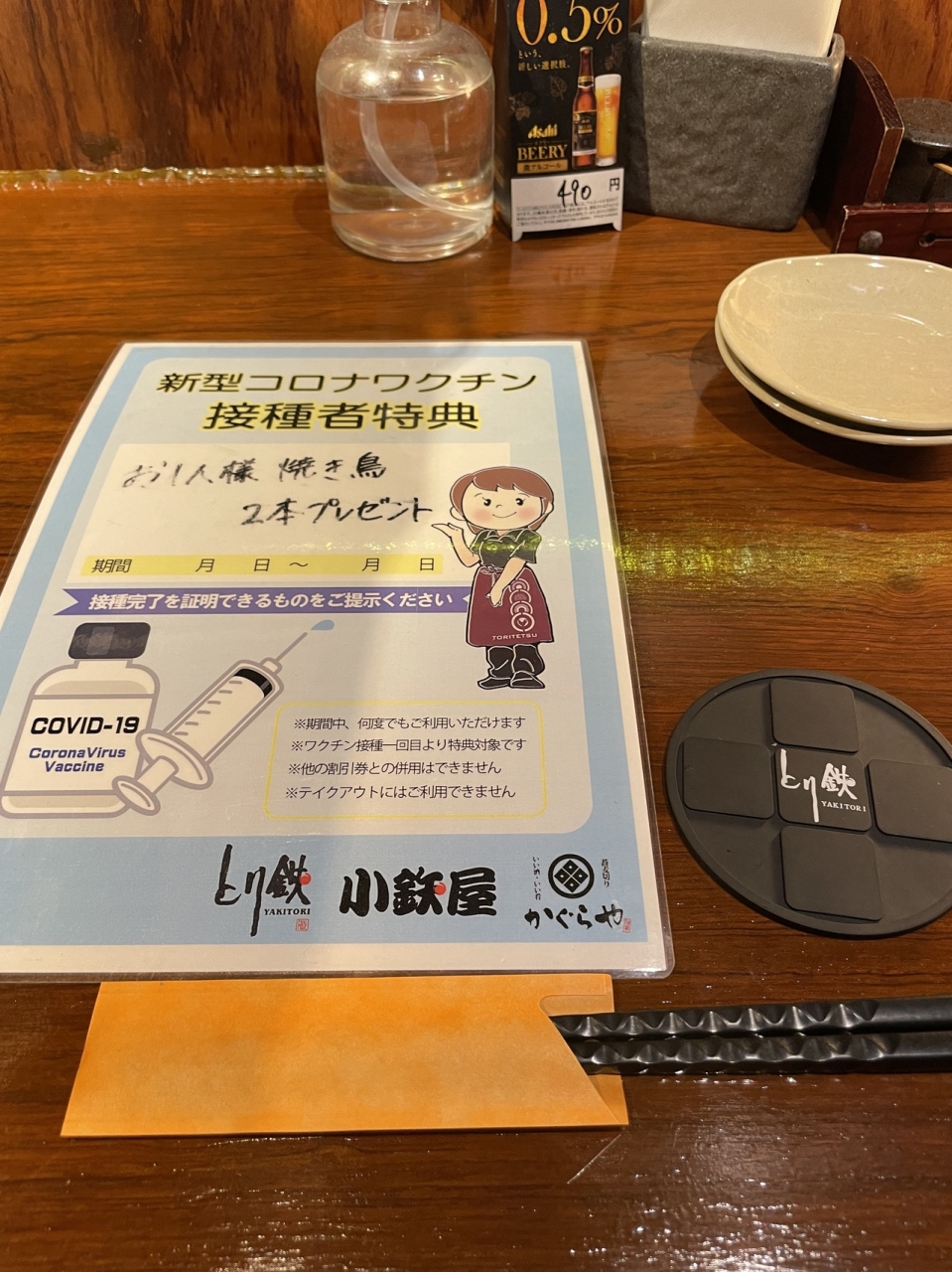 ワクチン接種証明を提示するとおまかせの焼き鳥2本サービスというのがあり、母娘で計4本無料で焼き鳥が食べられました。(ハツとせせりでした)