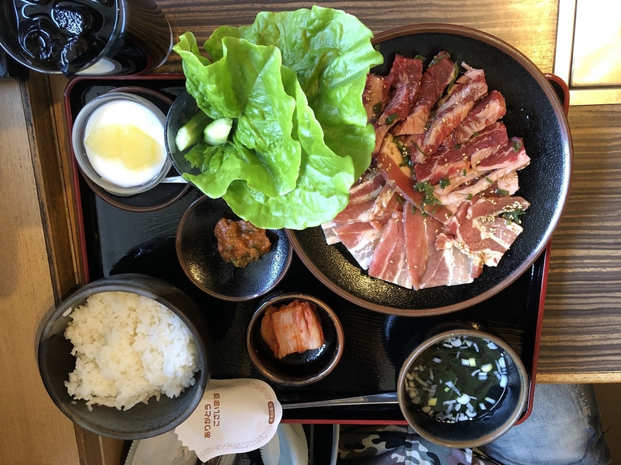 ライス・サンチュ・中落ちカルビ・豚カルビ・わかめスープ・キムチ・ドリンク・杏仁豆腐付き