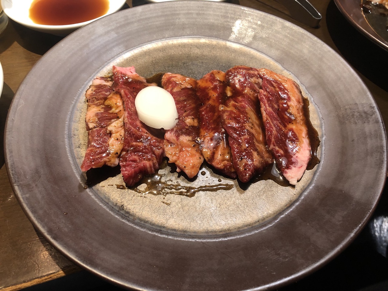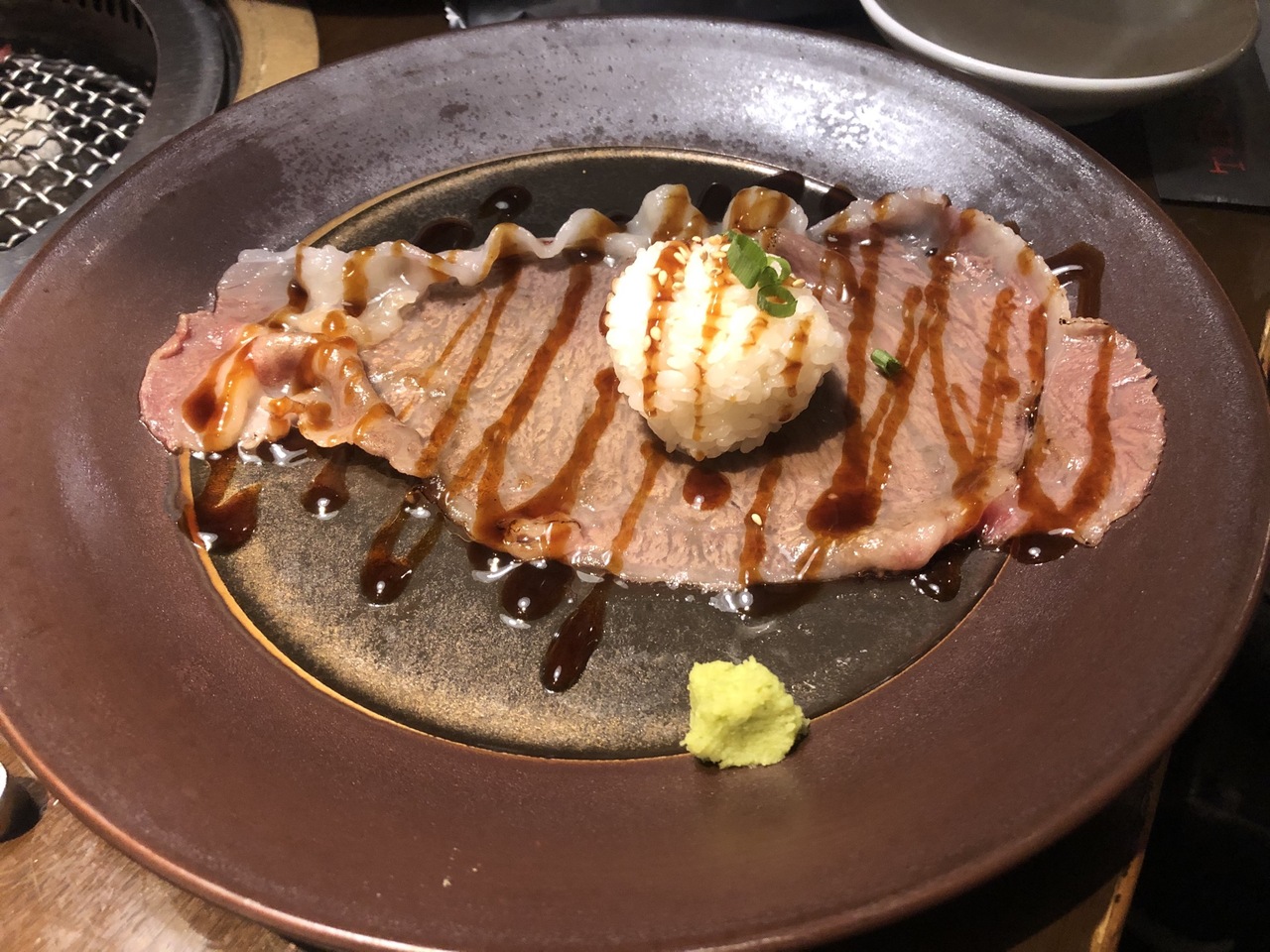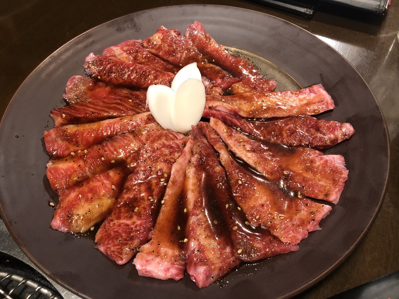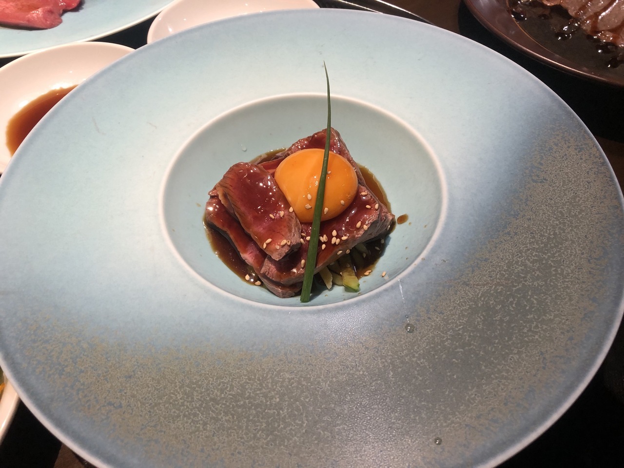厚切りタンTカット、カルビ、ハラミ、ヒレの湯引きユッケ、サーロイン1枚握り、4代目トラジサラダ、名物冷麺、タンつくね、ライス、お酒、フォンダンショコラなどをオーダー。