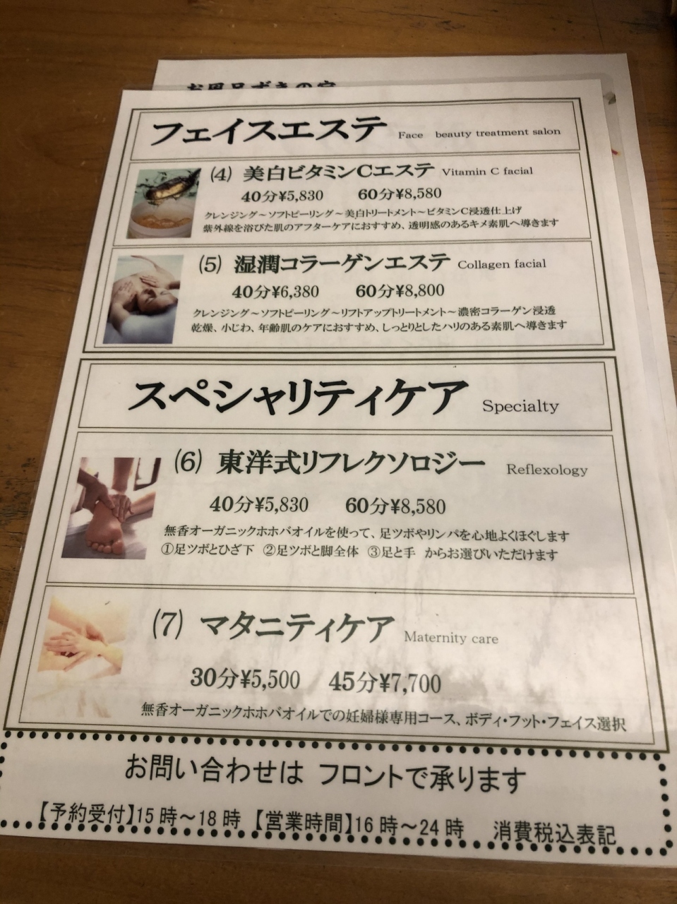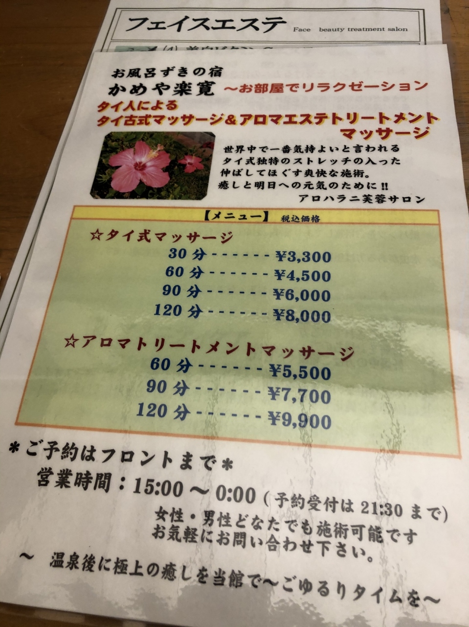 フロントもロビーもスタッフさんがとても丁寧でしたし、客室に呼べるマッサージの種類が豊富でした。
