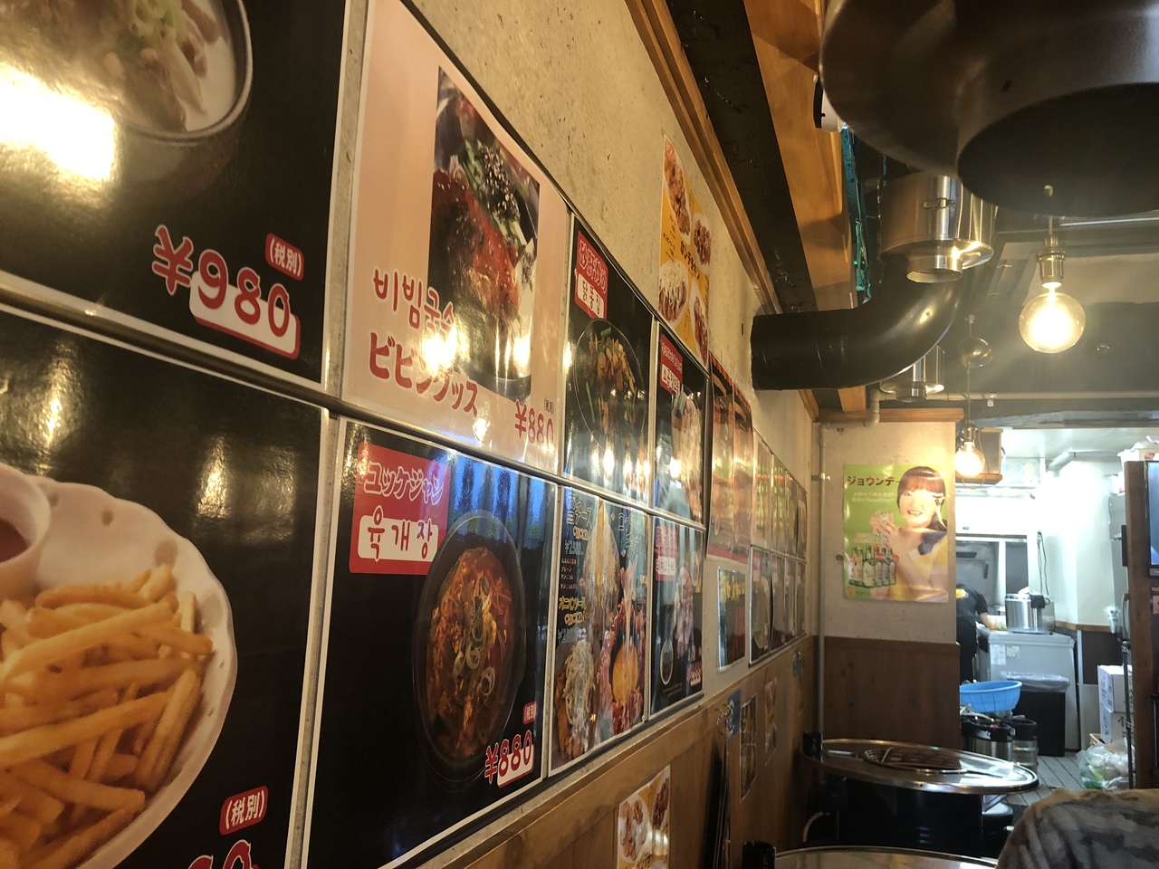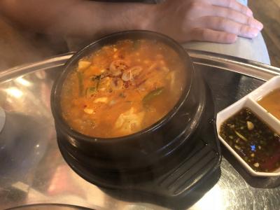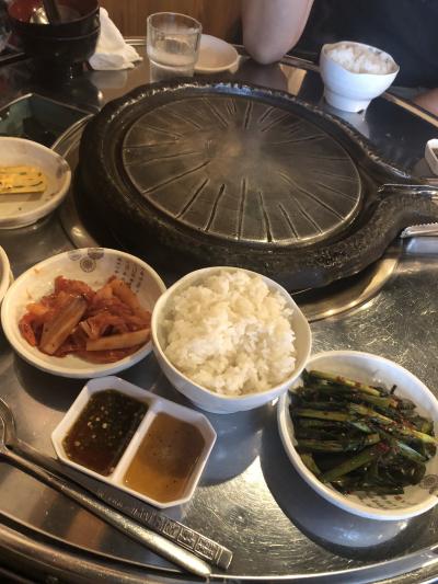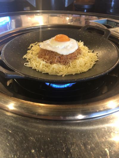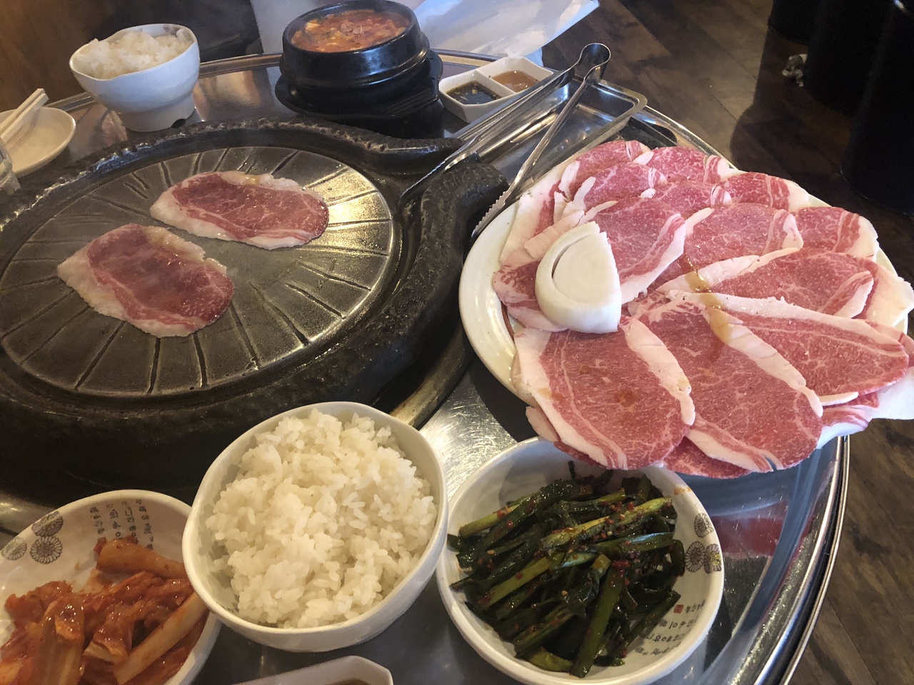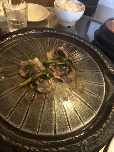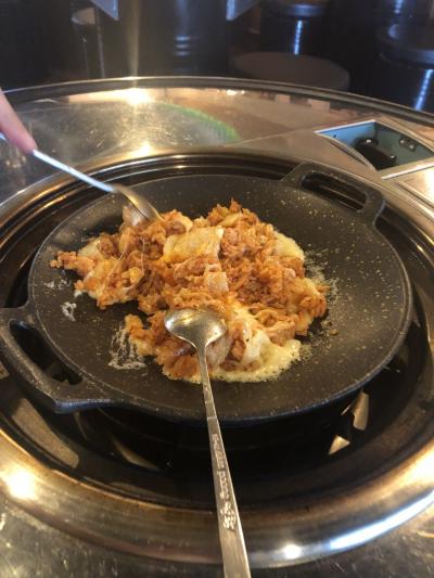 薄い牛肉をサッと両面焼いてニラを巻いて食べるやつ(スンドゥブ・白米付き)と、パパがチーズたっぷりチャーハンをオーダー。