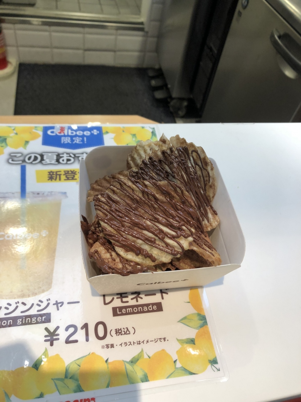 お店の揚げたてポテトチップスにチョコレートコーティングでとっても美味しい。
