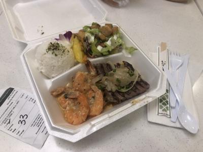 メニューNo2 のガーリックシュリンプ&ステーキ約$16をオーダー。