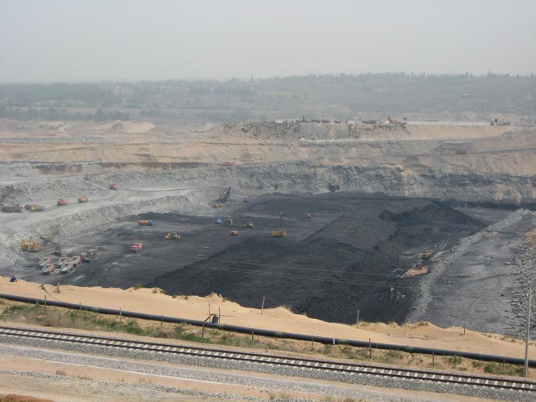 石炭の露天掘りです。オルドス市の南50Kmにあります。河川の川上に向って掘り進まれております。掘り終えた場所は、火災防止のために、ため池のようになっております。大型トラックがおもちゃのように見えます。手前には石炭を運ぶための線路があります。
