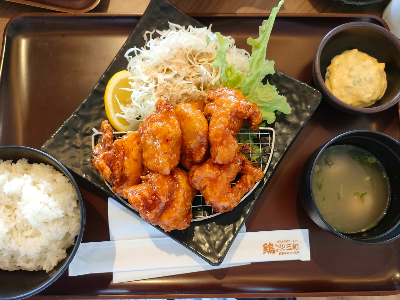 手っ取り早いのは、選択肢もあって席も豊富な3階にあるフードコート。10店舗近くある中から、今回は子供主導でこちらの「鶏三和」さんをチョイス。子供はお子様用親子丼セット、自分は鶏南蛮定食。鶏南蛮は通常は5個ですが、1個追加して6個セットで注文。