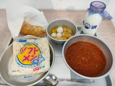メニューは「おいしい給食ミートソースセット」。ミートソースにソフト麺、揚げパン、フルーツポンチ、牛乳。ミートソースがはねないように慎重に食べていたらお腹いっぱいになりました。