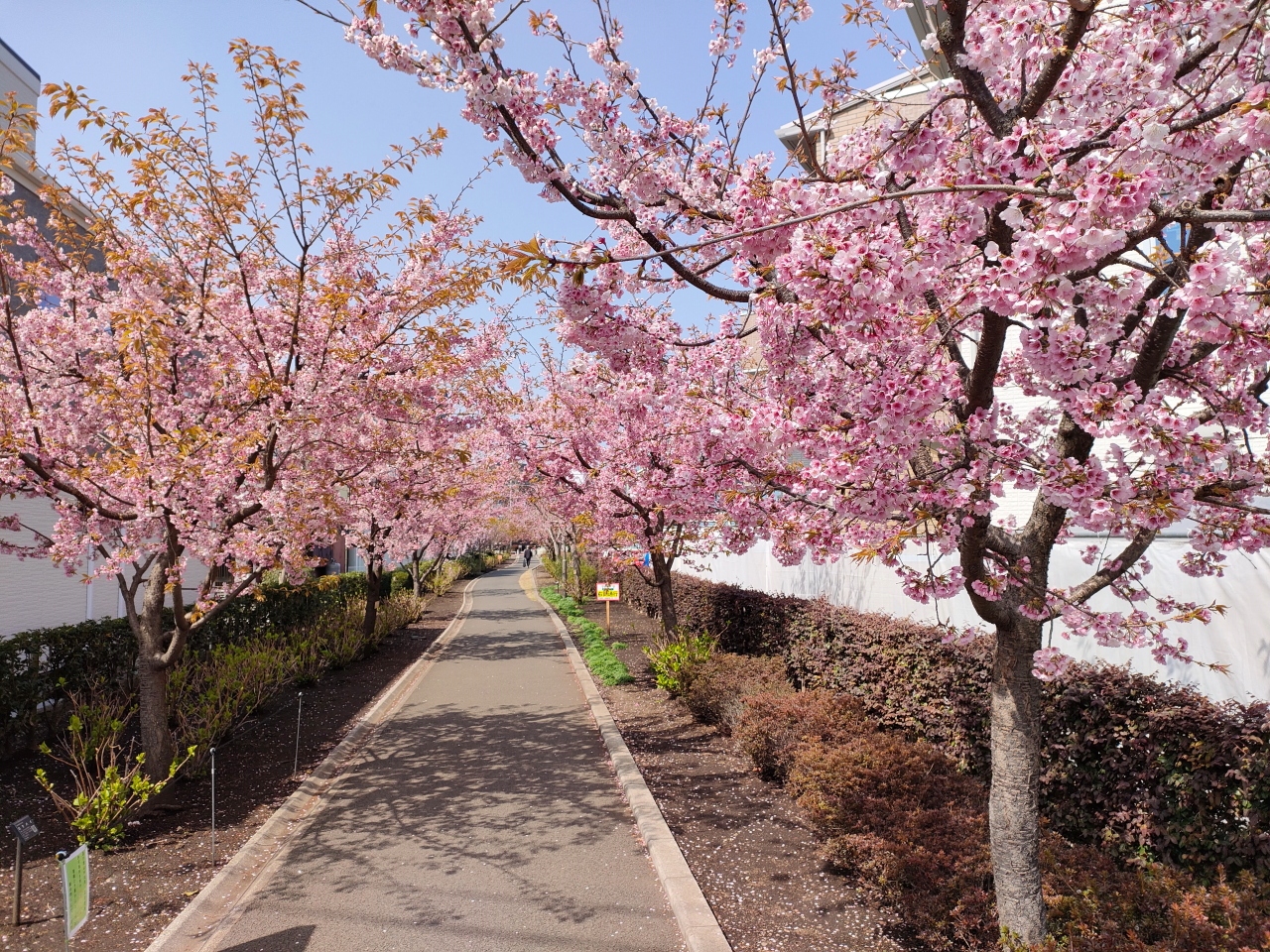 相模が丘仲良し小道は、小田急相模原駅付近から約1.6km続く歩行者専用道です。道沿いには、なんと64種類もの桜の木が植わっており、2月~5月頃まで、長きにわたって花を楽しむことができます。