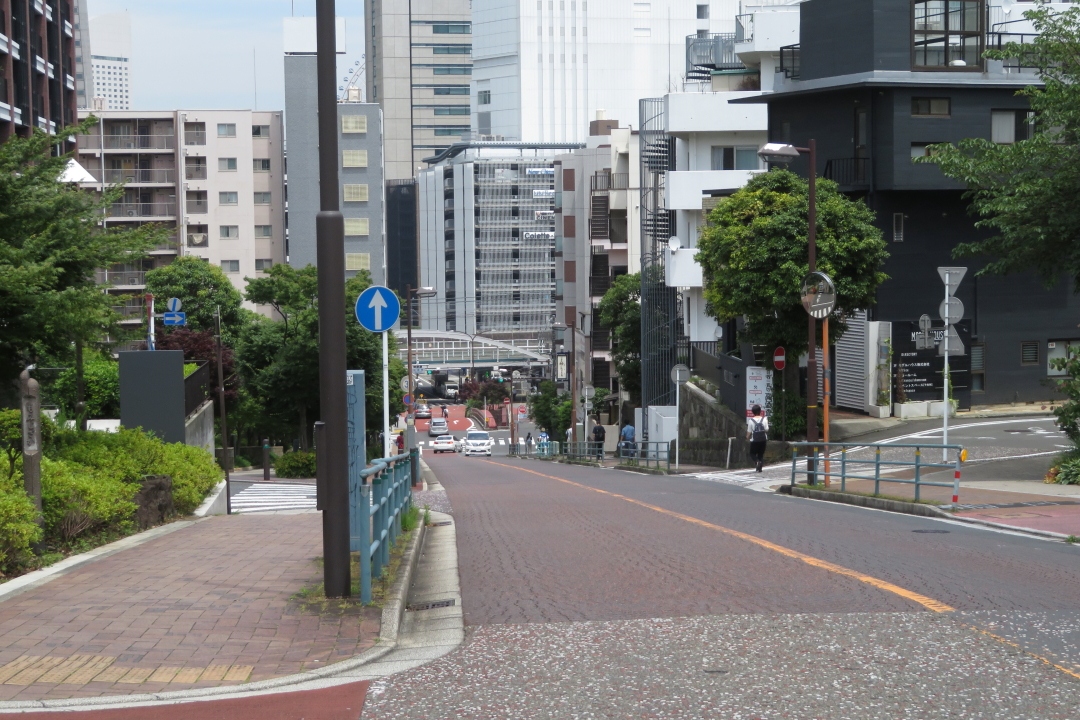 紅葉橋交差点からは、一気に坂を上る結構な急坂です。しかも真っすぐです。上るのは大変ですが、振り返ればランドマークタワーを望むことができます。