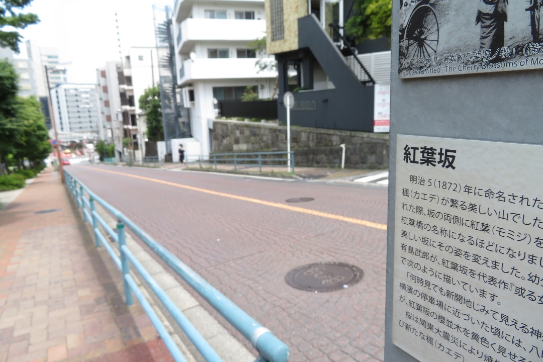 桜木町駅から線路沿いの道を進むと、紅葉橋交差点にぶつかります。この交差点の西方面に続く坂道が、紅葉坂です。